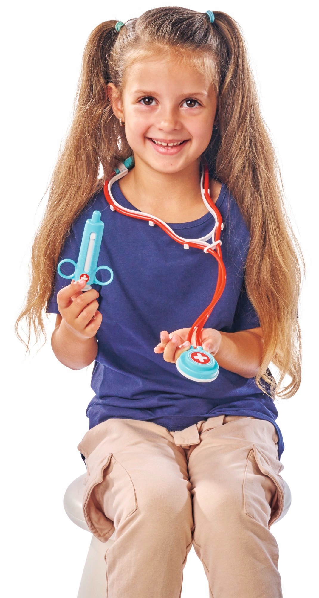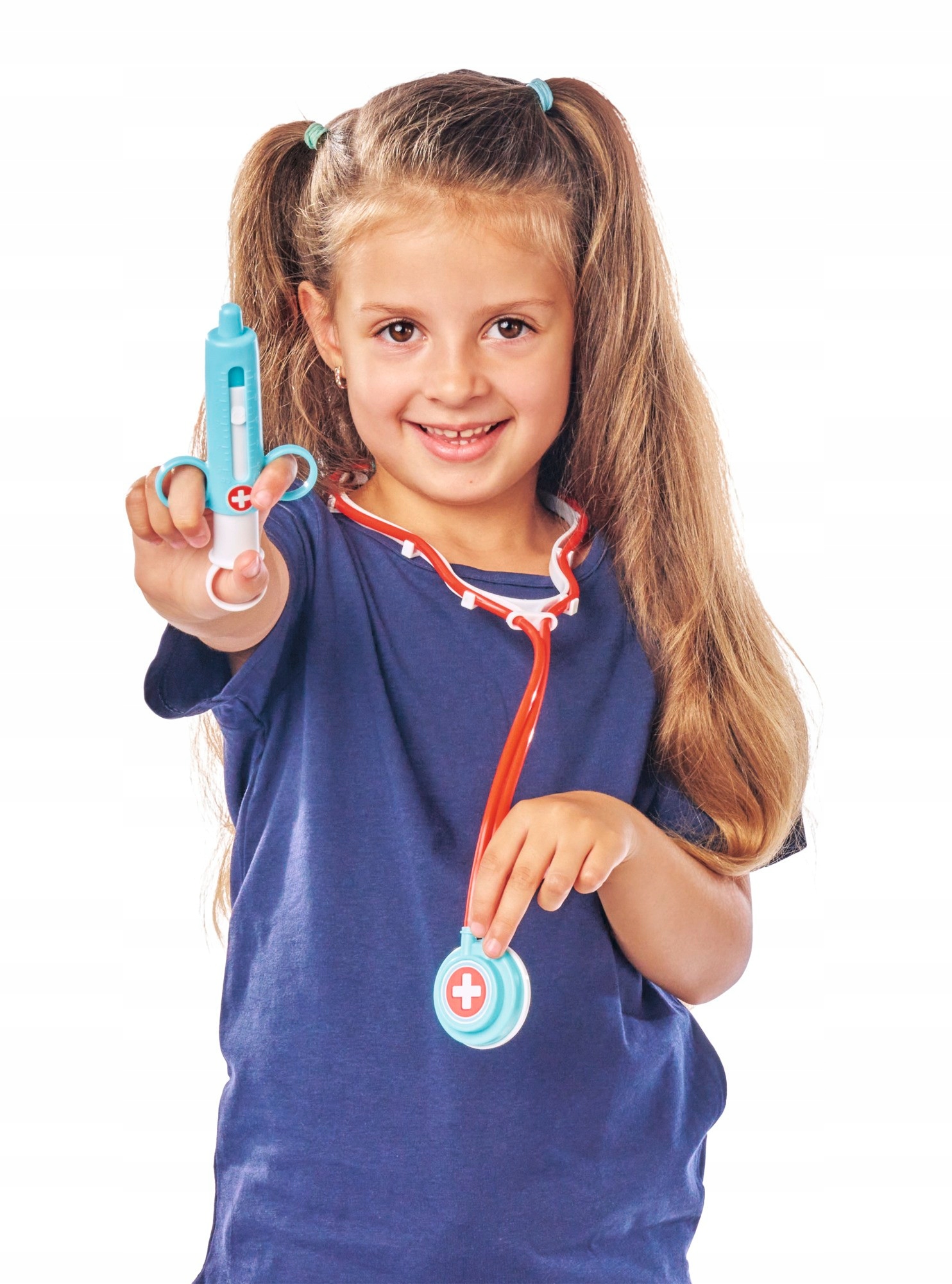 Набір складається з 10 реалістичних медичних аксесуарів , включаючи стетоскоп, неврологічний молоток, шприц, термометр та інші необхідні аксесуари, які можуть легко вмістити в зручну валізу. Валіза є не лише естетичною, але й функціональною, завдяки якому маленькі лікарі можуть взяти своє обладнання в будь -яке місце - готові до дії в будь -який час!