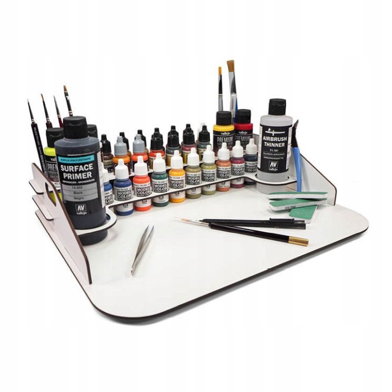 Публіка для малювання. У ньому є місце для 52 фарб у 17 мл пляшок, 8 пляшок 35 мл або 60 мл і 22 щітки. Потрібна самостійність. Він не містить фарб і аксесуарів. Були використані для ілюстрації функціональності продукту