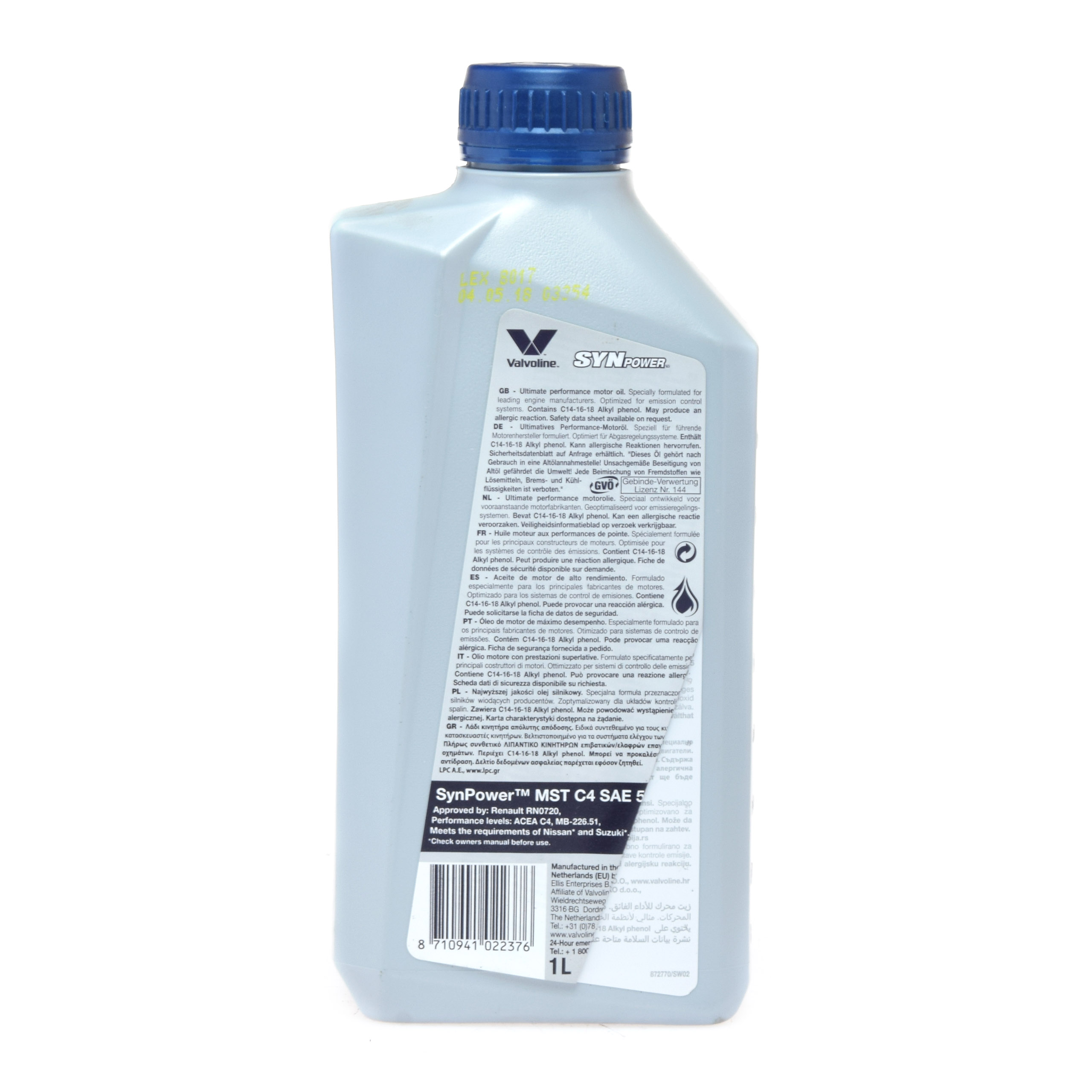 Просматривая «Valvoline SYNPOWER MST C4 1 л 5W-30», вы можете быть уверены, что данный товар из каталога «Синтетические» будет доставлен из Польши и проверен на целостность. В цене товара, указанной на сайте, учтена доставка из Польши. Внимание!!! Товары для Евросоюза, согласно законодательству стран Евросоюза, могут отличаться упаковкой или наполнением.