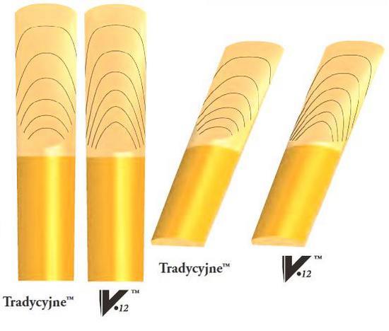 На діаграмах кінців окремих язичків послідовні , дугоподібні лінії відповідають наступним шарам деревини однакової товщини. Чим гостріша дуга, позначена на схемі, тим більша товщина клина та серцевини тростини (і менша товщина зовнішніх поверхонь).