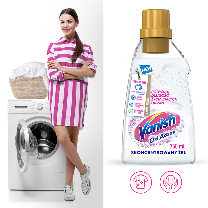 Він також надійно працює за нижчих температур і коротших циклів прання. Нова формула гелю Vanish без вмісту хлору підсилює ефект прання та допомагає продовжити термін служби вашого одягу! Достатньо однієї мірної ложки.