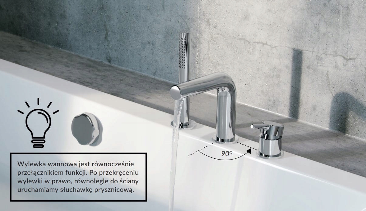 Цей змішувач має механічний перемикач функцій, захований в корпусі виливу - після повороту виливу вправо, в положення, паралельне стіні, ми включаємо душову трубку. Через те, що краплі води можуть залишатися в носику, ми рекомендуємо встановлювати ручку так, щоб вона не знаходилася безпосередньо під аератором носика.