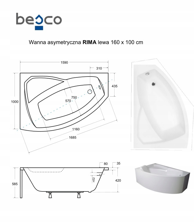 Опис продукту Кутова ванна Besco Rima 160x100 см ліва біла #WAR-160-NL