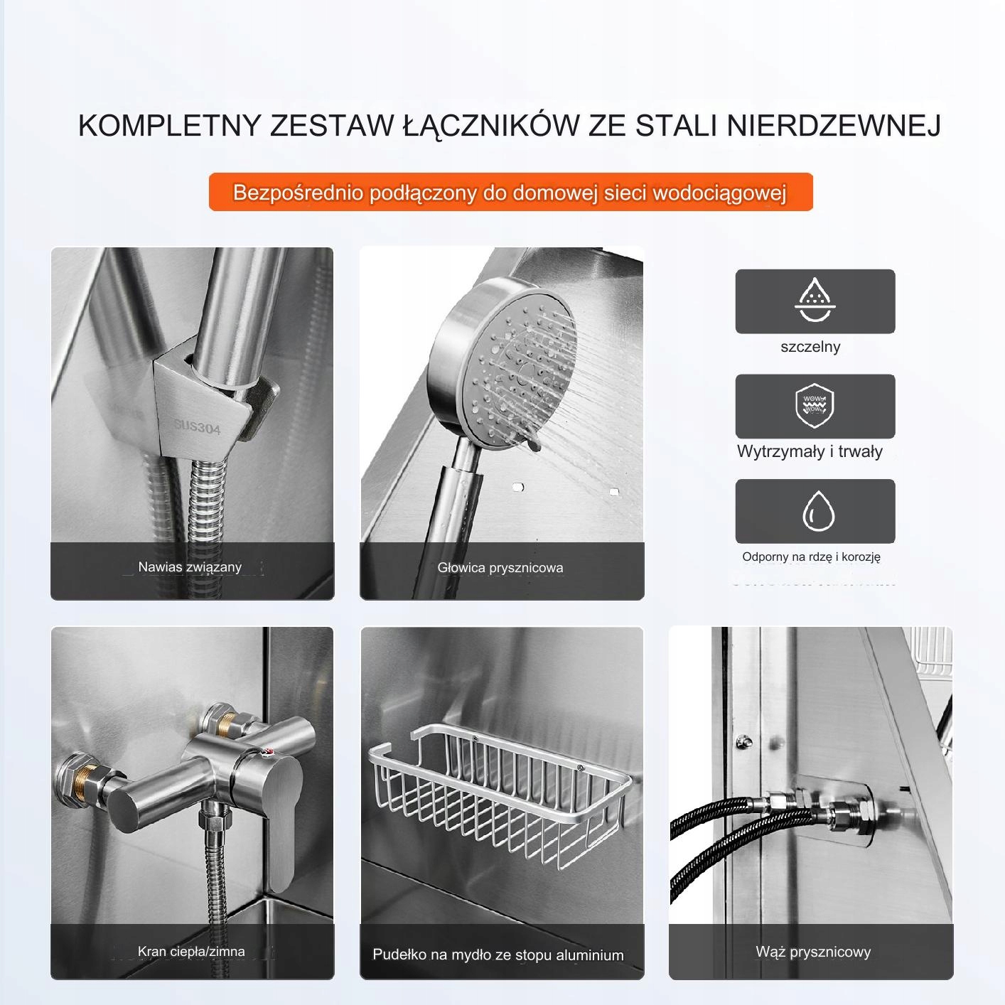 оснащений душовою головкою, краном та рамкою опорної нержавіючої сталі, яку можна з'єднати безпосередньо до домашнього шланга. Вони стійкі до іржі та міцних. Додаткове посуд для мила з алюмінієвого сплаву забезпечує тривалий термін використання.