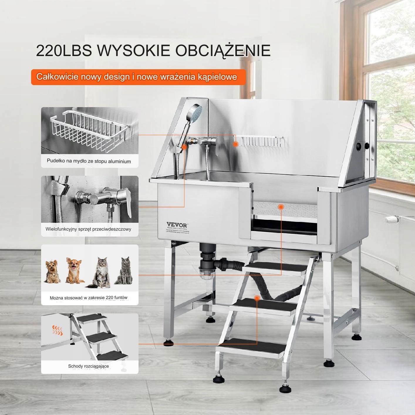 , оснащений верхнім і нижнім пандусом, а також багатофункціональним душовим пристроєм, ви можете помістити аксесуари для чищення тварин у мильну посуд, а герметична засувка не просочиться під час догляду за тваринами, забезпечуючи безтурботну ванну.