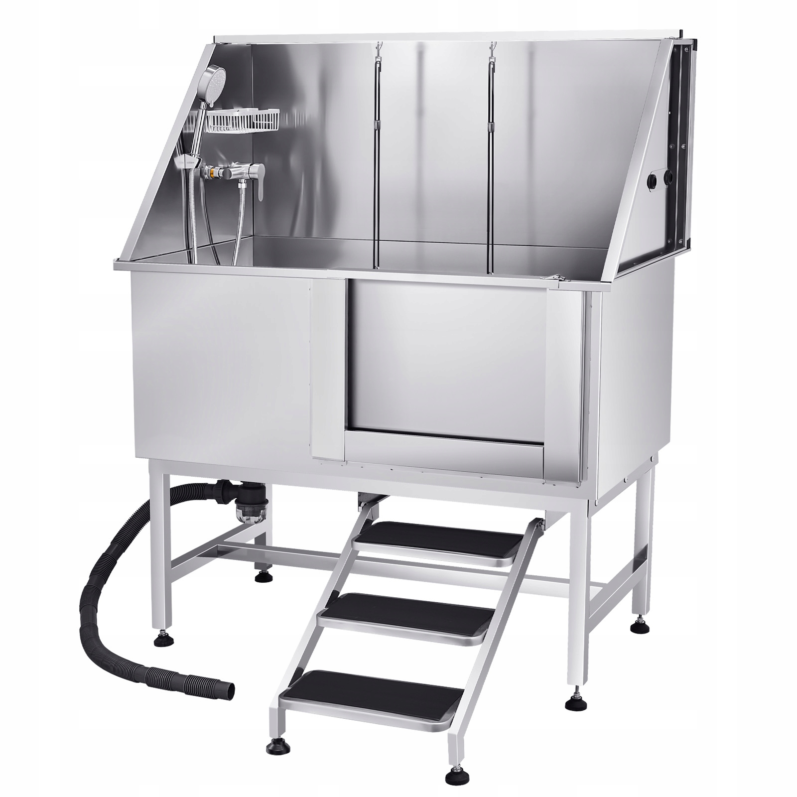Інтегрована конструкція: Ванна для собак оснащена подвійними кранами для гарячої та холодної води керування душовою лійкою та тримачем для мила. Завдяки цьому рішенню купання вашого вихованця стане легким і ефективним. Пластина для фільтрації води, виготовлена з поліетилену, забезпечує неслизьку дренажну поверхню, а застібка для качиного дзьоба, що входить у комплект, запобігає випадковому відкриванню дверцят тваринами під час купання та безпечно утримує їх усередині