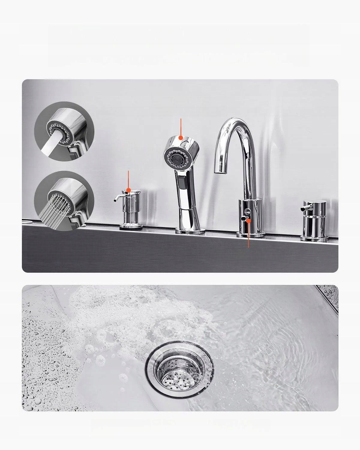 Ванна виготовлена з нержавіючої сталі, зносостійкої. Він пропонує висувну душову лійку, кран для гарячої та холодної води та інноваційну систему ущільнень, яка забезпечує безпечне використання.