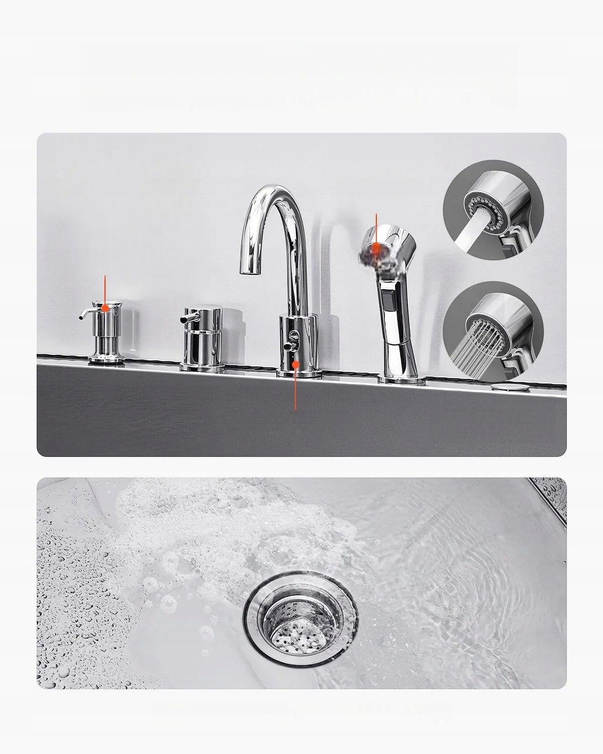 Багатофункціональна зона з високоякісної нержавіючої сталі 304. Зносостійкий умивальник, з дозатором мила і висувною душовою лійкою. Дозволяє підключати гарячу та холодну воду та пропонує два режими душу під напором.