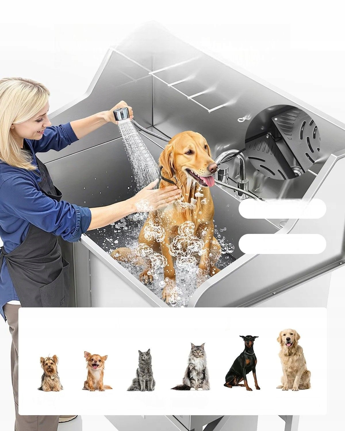 Нековзкі та щільні вкладки, які забезпечують стабільність під час купання. Процес догляду без згинів дозволяє легко мити домашніх тварин у зручному положенні.