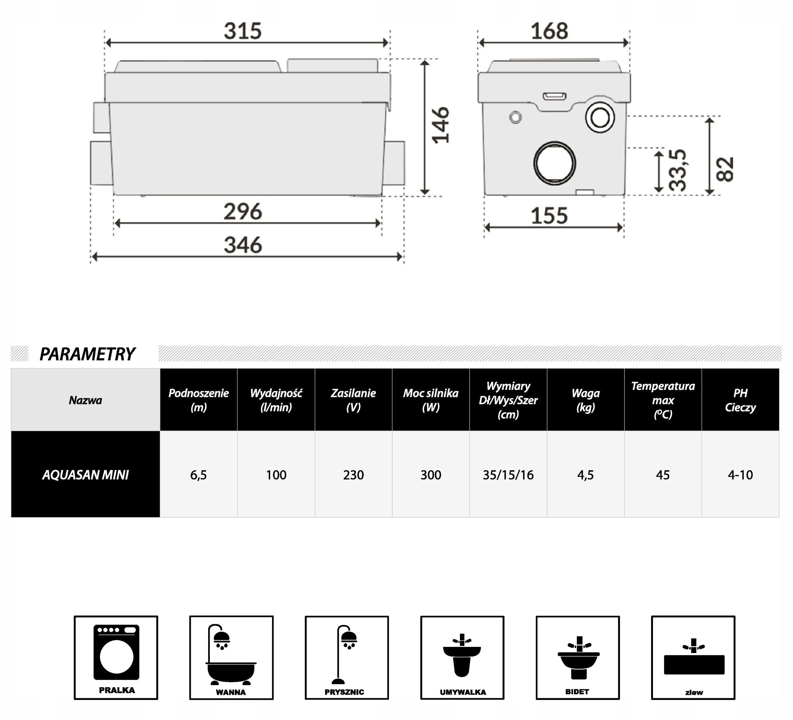 Насос оснащений двигуном потужністю 300 Вт, завдяки якому він ефективно та надійно відкачує воду. Працює ефективно, збираючи до 100 літрів води за хвилину. Цього достатньо, щоб з легкістю задовольнити щоденні потреби, пов’язані зі зливом води у ванній чи на кухні. Пристрій призначений для відведення води з максимальною температурою до 45°C, що характерно для використання у ванних кімнатах і на кухнях.