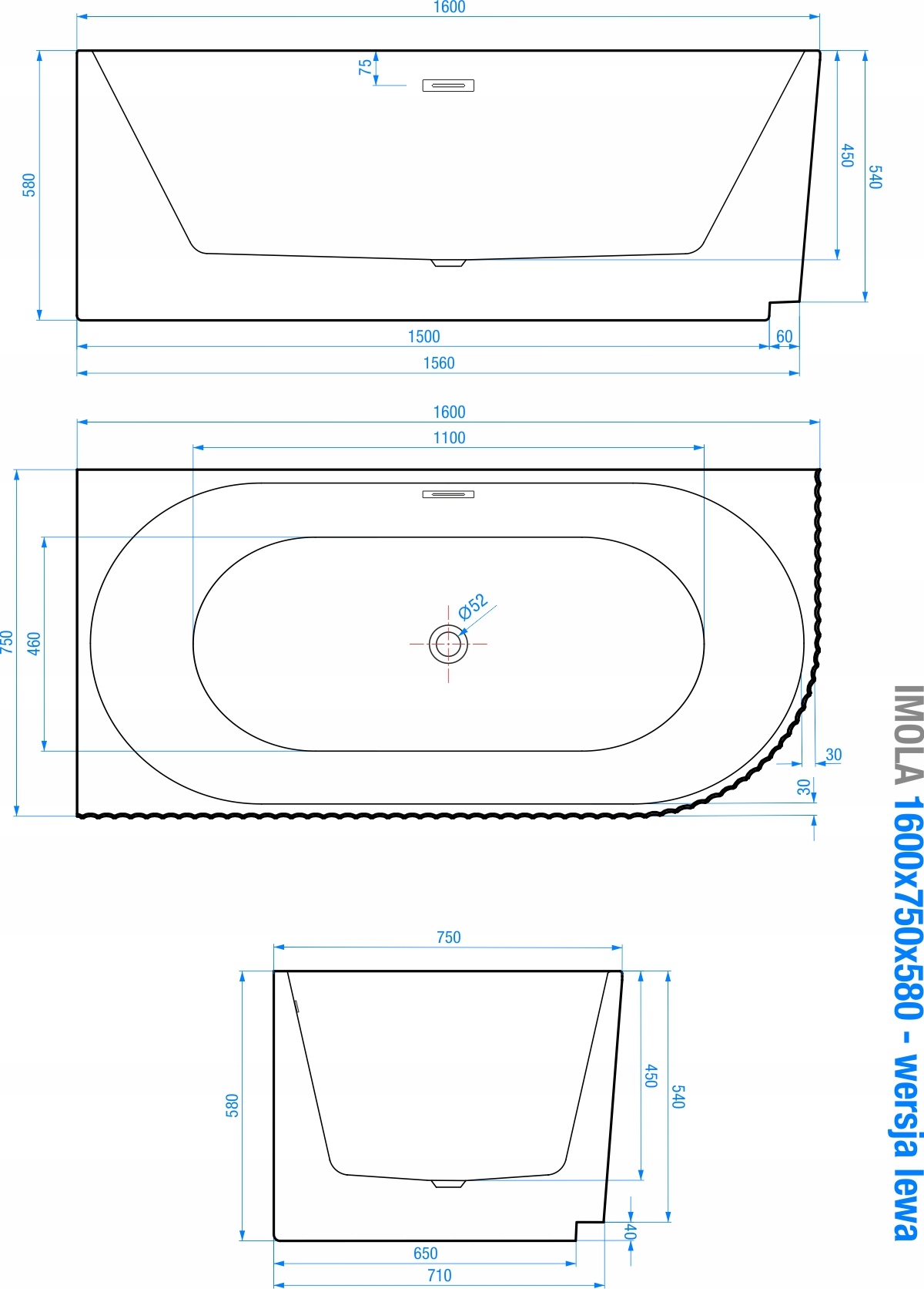 У нашій пропозиції ви також знайдете ідентичну модель розміром 160x75 у правому виконанні, а також таку ж модель окремо стоячої ванни IMOLA у розмірах 150x75 та 170x78 см у лівому та правому виконанні.
