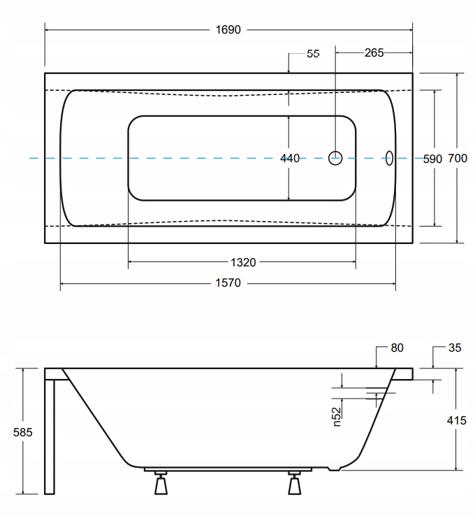 Беско прямокутна ванна 170x70 Оптима