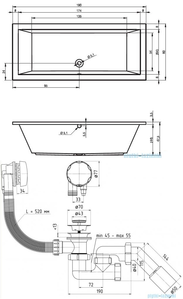 Прямокутна ванна Lusso 190х80 від Riho + НІЖКИ + АВТОМАТИЧНИЙ СИФОН AKCES
