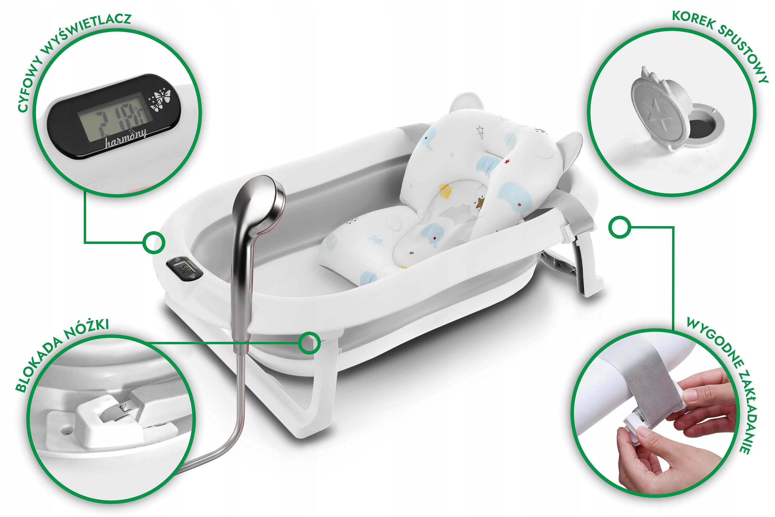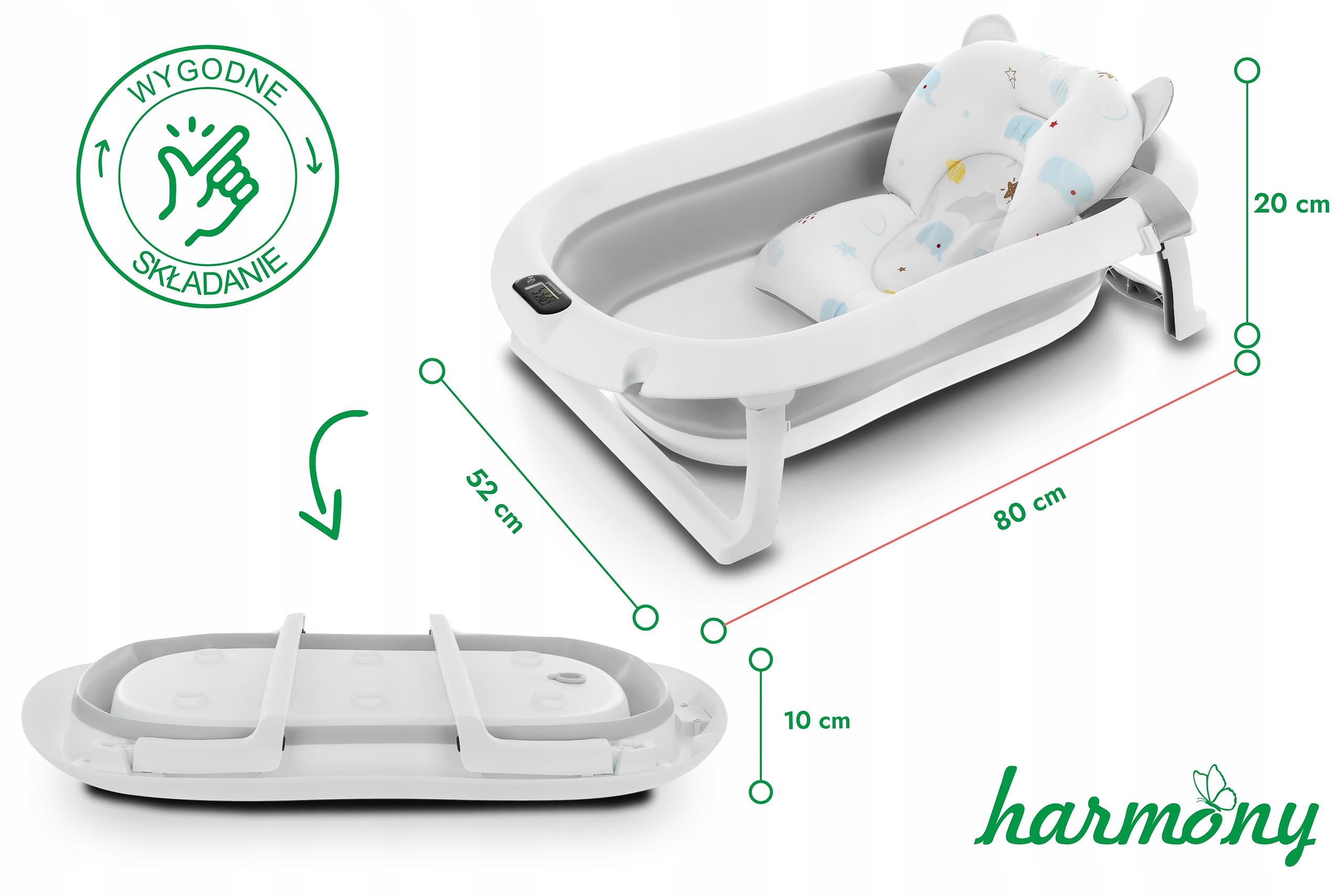 Ванна була розроблена для щоденного комфорту батьків. Завдяки розкладному дизайну ви можете легко зберігати його в гардеробі або взяти його з собою в подорож. Вбудований термометр дозволяє стежити за температурою води, що впевнено, що дитина буде купатися в зручних умовах (перед тим, як покласти дитину у воду, завжди переконайтеся, що його температура правильна!). Додаткова подушка, встановлена ​​на ремені, дозволяє проводити ванну новонароджених, стабілізуючи її положення.
