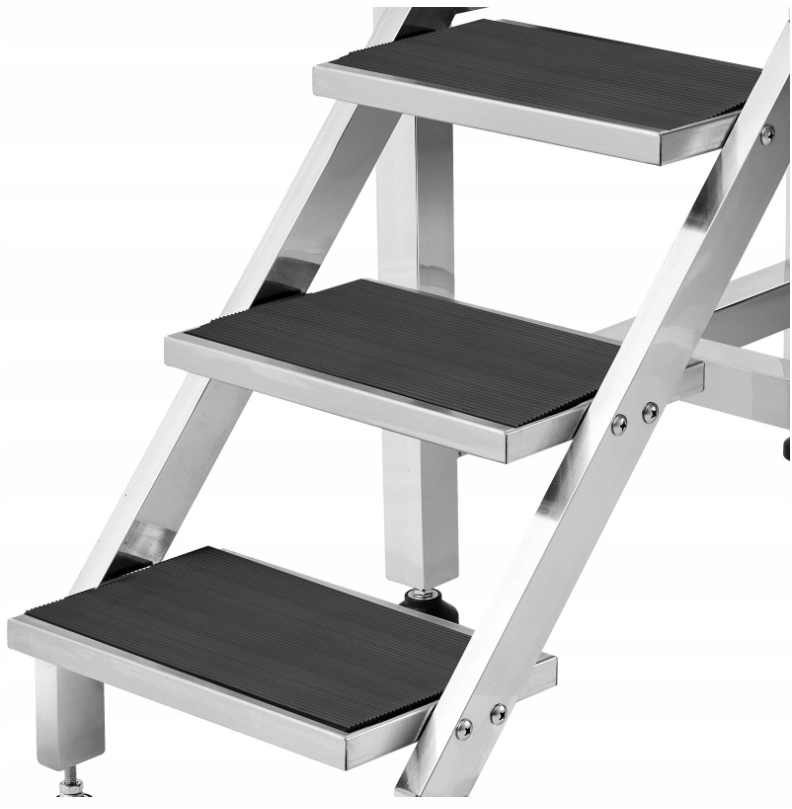 Ванна обладнана з протиковзкими сходами, які полегшують тваринам безпечний вхід і вихід, а також відсутність гострих країв, що мінімізує ризик травм під час купання . Регульована підставка для ніг і вбудована підставка підвищують комфорт як для тварин, так і для опікунів.