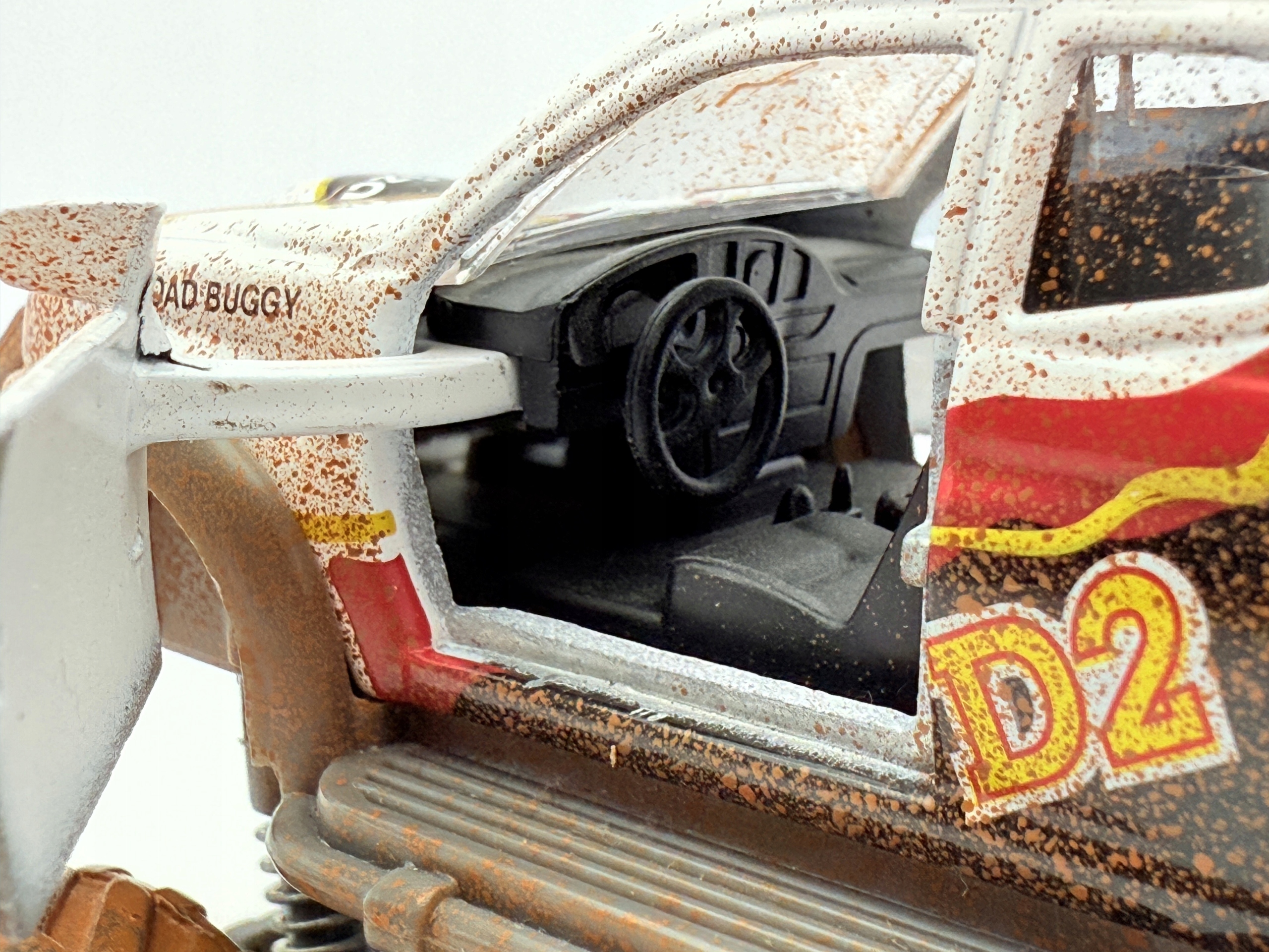 Ця весна є унікальною моделлю польової баггі, яка привертає увагу своєю суцільною конструкцією та увагою до деталей. Зроблена з металу з пластиковими елементами, модель представляє білий колір з динамічними червоними та чорними акцентами, які надають йому характер. Додаткові функції, такі як відкриття дверей та світло на даху, роблять його привабливими для колекціонерів. Стан моделі хороший, з видимими слідами використання, що дає їй справжність. Це прекрасне доповнення до кожної колекції джерел, особливо для шанувальників транспортних засобів Off -Road.