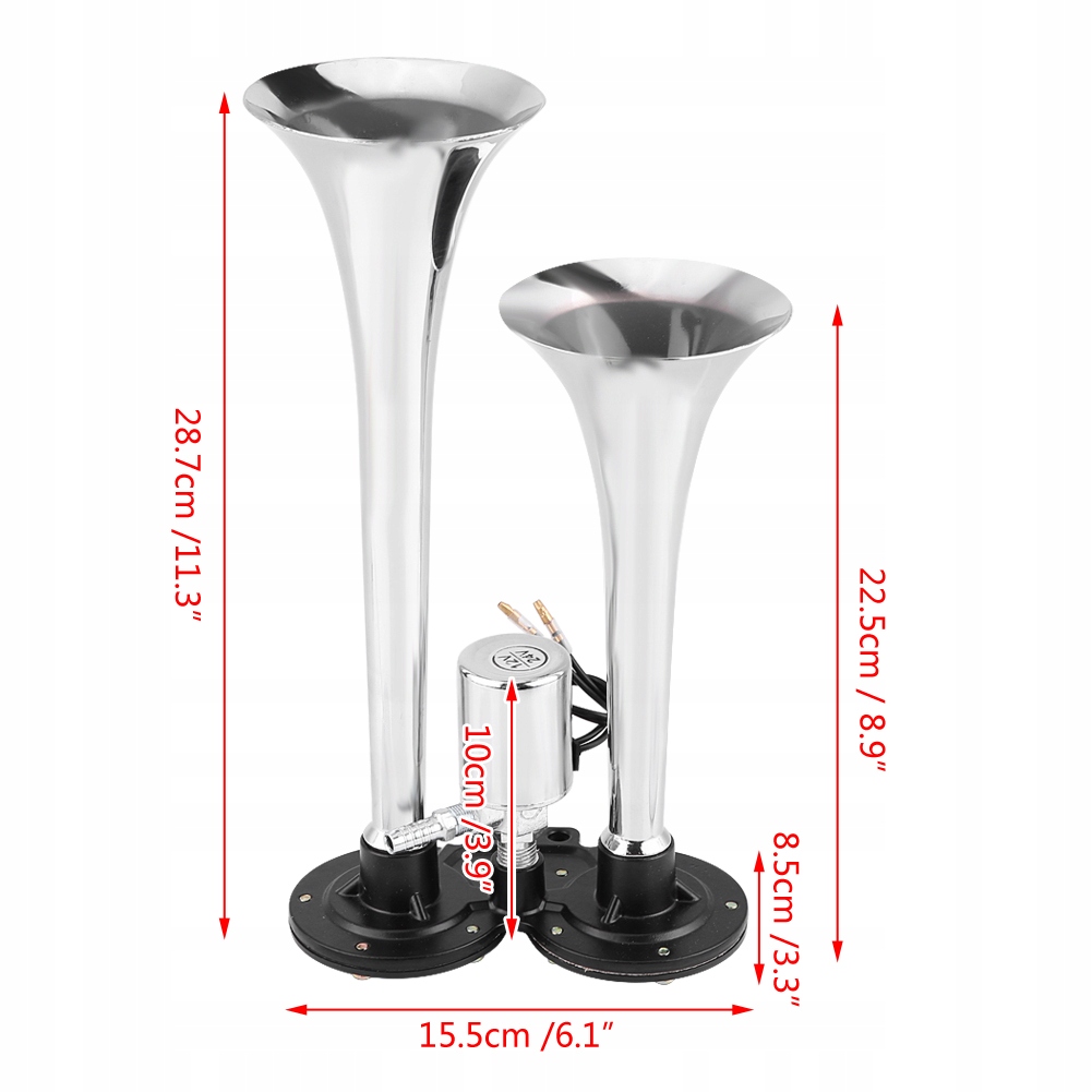 - Цей подвійний пневматичний рупор виготовлений із хромованого цинку для максимальної міцності та довговічності для тривалого використання; і розроблений, щоб витримувати погодні умови. Він може видавати гучний потужний звук налаштованого поїзда. Він може відтворювати звук потужністю до 150 ДБ. Сильний гуркіт привертає увагу всіх і його можна почути всюди.