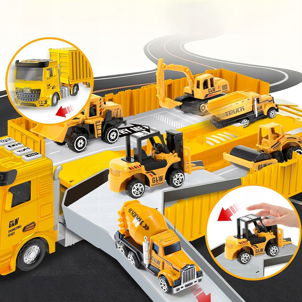 Відкрита каюта причепа: вона перетворюється на велику парковку з двома слайдом - з її допомогою дітей може "дозволити" маленькими автомобілями на будівельну ділянку, а додаткову катапульту автомобілів додає динаміку та емоцій. Він використовується для збереження будівельних транспортних засобів - вчить дітей організовувати та дозволяє створювати складні, геніальні будівельні майданчики.