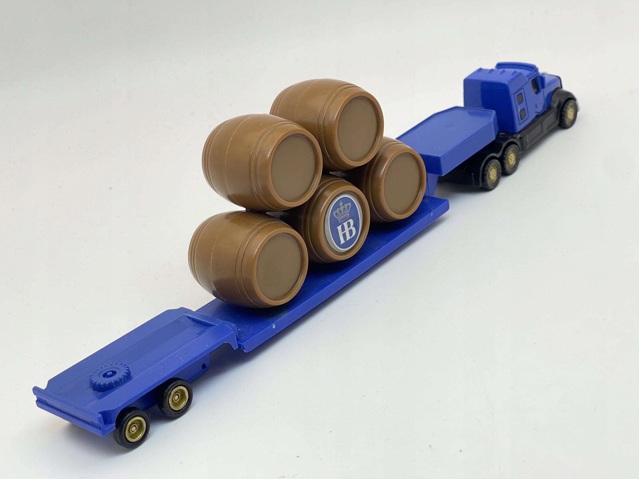 Ця пластикова пружина показує вантажівку з причепом із коричневими бочками з логотипом HB. З масштабом 1:87 і довжиною 79 мм модель ідеально підходить для любителів деталей. Незважаючи на незначні ознаки зносу, модель у дуже хорошому стані, що робить її привабливим доповненням до будь-якої колекції.