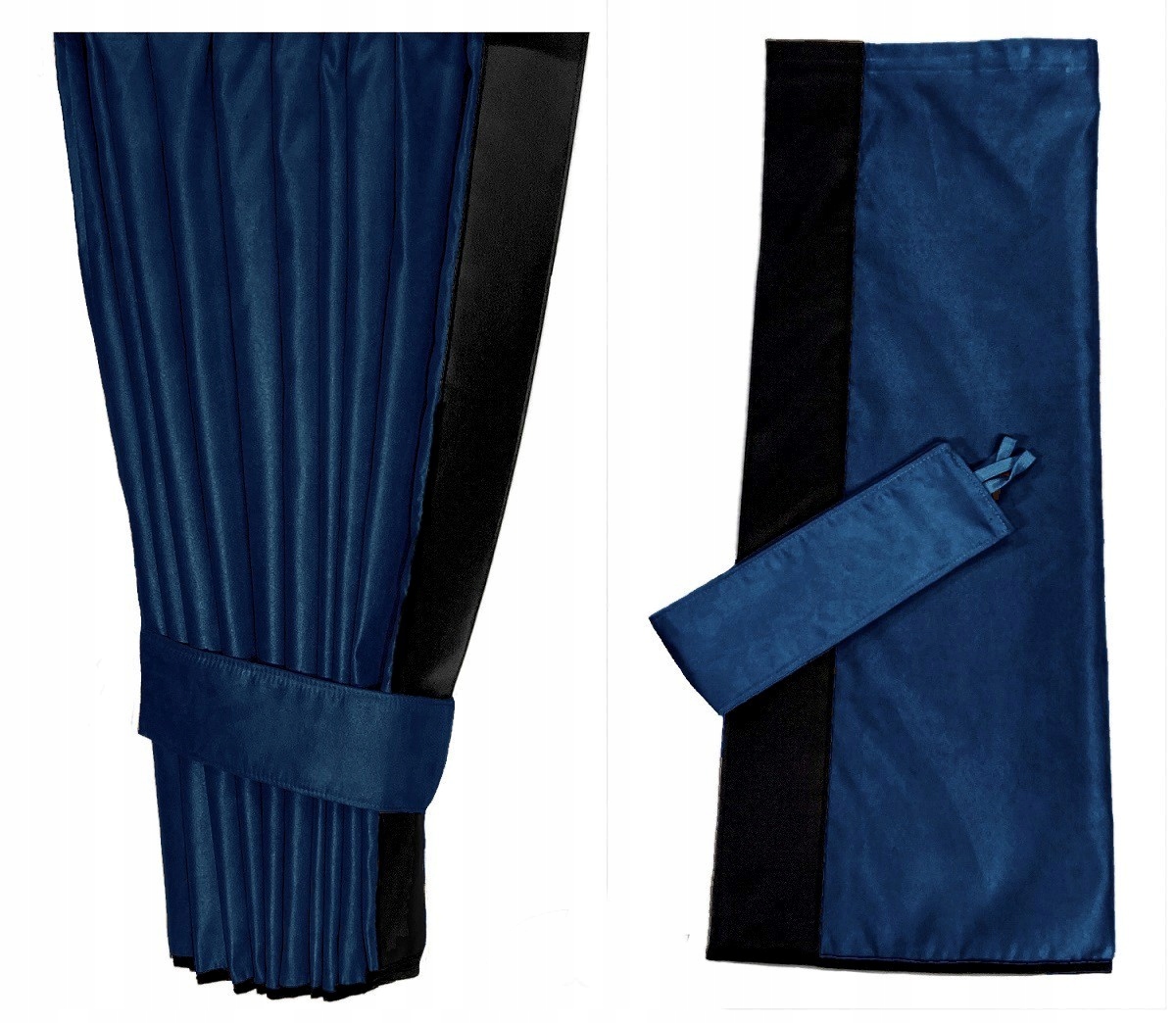 Кожна бічна штора оздоблена кромкою з екошкіри. Ширина краю 9 см. - дивіться фотографії