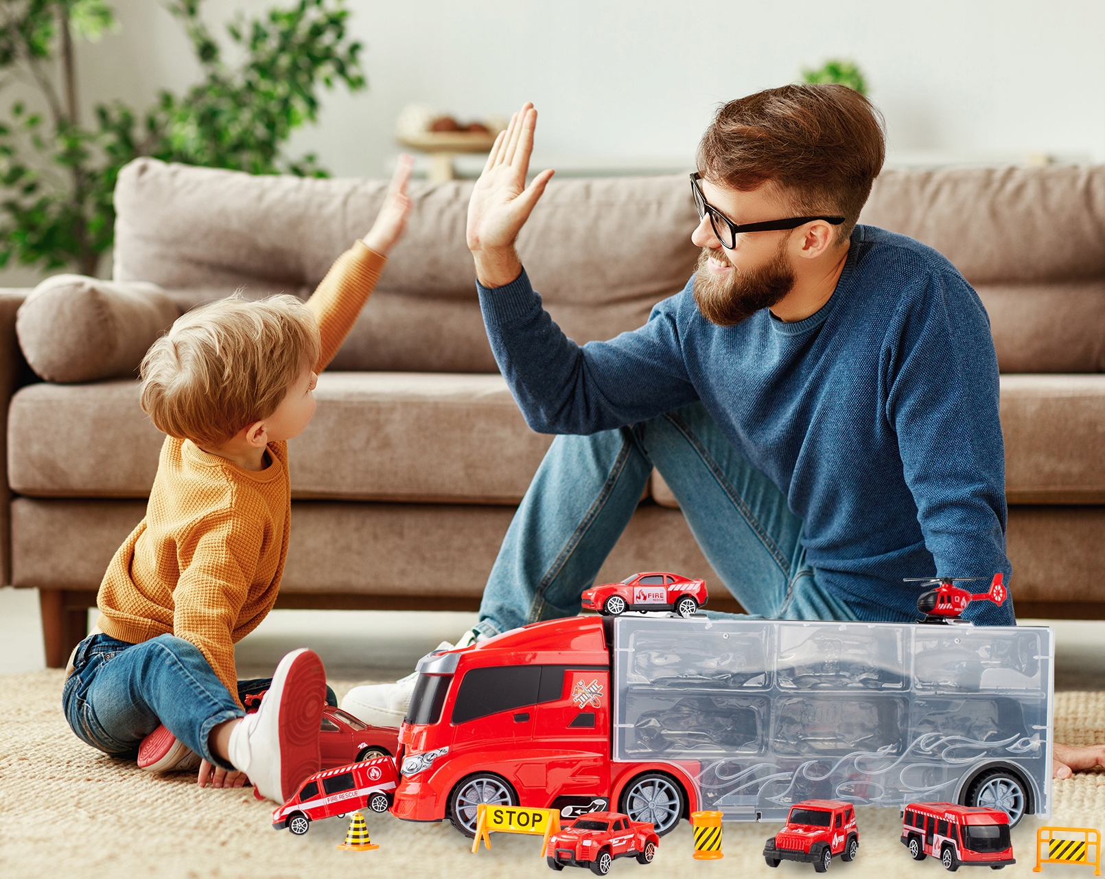 Вантажівка сама по собі є не тільки чудовою іграшкою, але й служить складом для менших автомобілів.