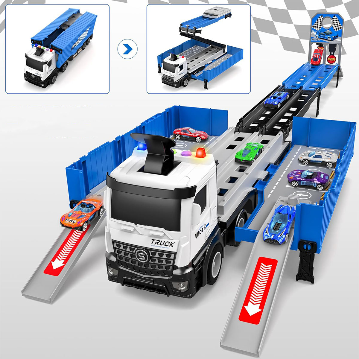 ✅Багатофункціональна транспортна вантажівка: наша транспортна вантажівка є складною іграшкою. Він оснащений транспортним відсіком і може завантажити та перевезти 8 невеликих гоночних автомобілів. Він також має просту у використанні механічну конструкцію, яка дозволяє дітям відчути процес транспортування, стимулює дитячу творчість і допомагає розвивати їхнє просторове сприйняття, координацію та соціальні навички за допомогою симуляції транспортування та перегонів.