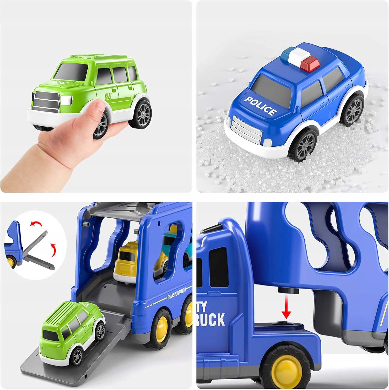 Просто штовхніть велику вантажівку вперед, і вона перевезе чотири маленькі транспортні засоби! Голова великого транспортера також обертається. Ви можете відокремити кабіну від вантажного відділення, а потім відкрити двері багажника, щоб загнати автомобілі. А коли штовхати машинки назад, вони самі поїдуть вперед. Іграшка для хлопчиків від 3 років і старше.