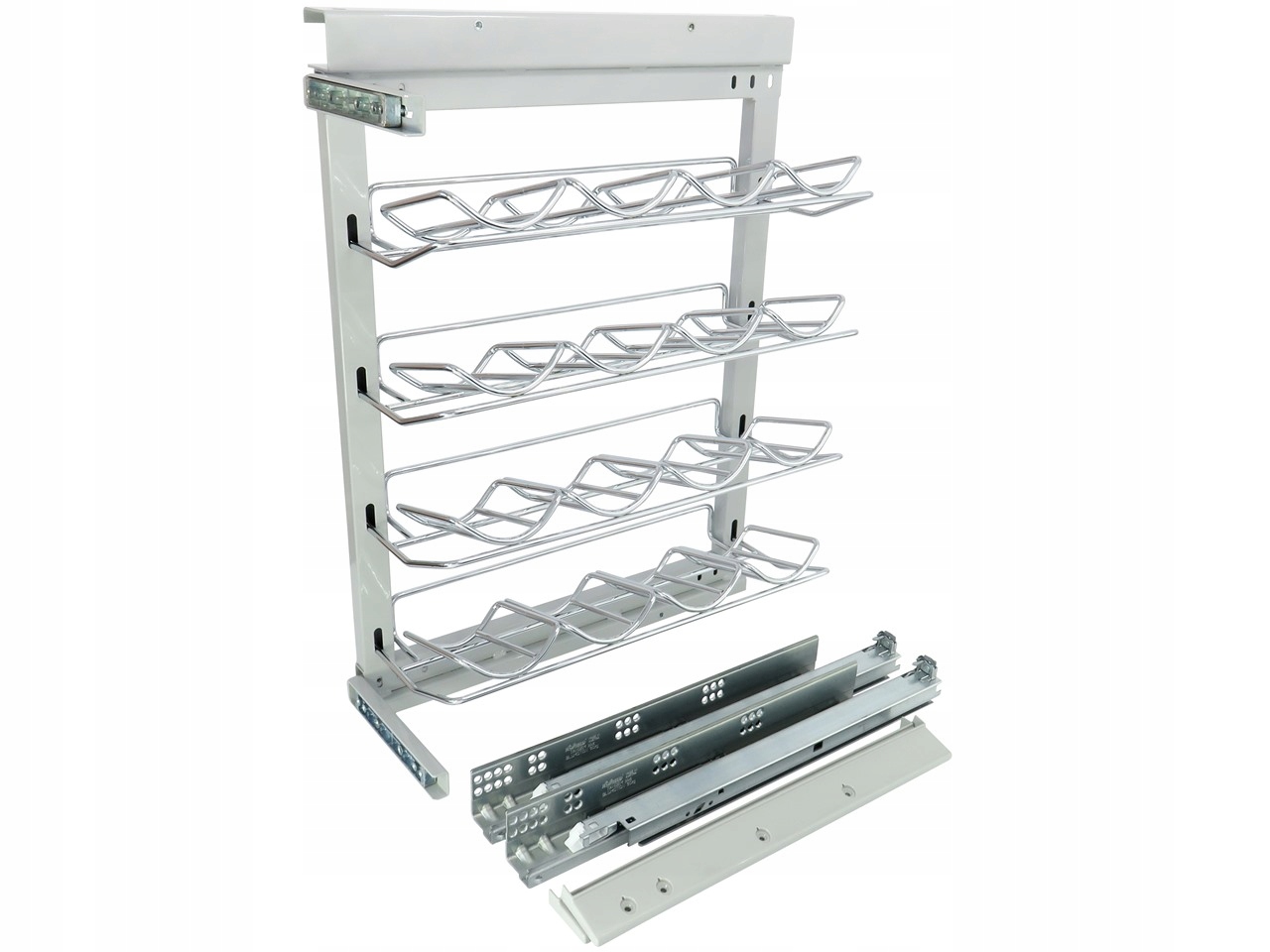 Вантаж для пляшок - ще одна пропозиція від Strarax. Призначений для зручного зберігання пляшок на решітчастих полицях. Кошики/полиці легко збираються. Кожна полиця вміщує чотири пляшки. Все це працює на направляючих від відомої компанії BLUM, з функціями повного висування та плавного закривання. Допустиме навантаження системи 30 кілограм.