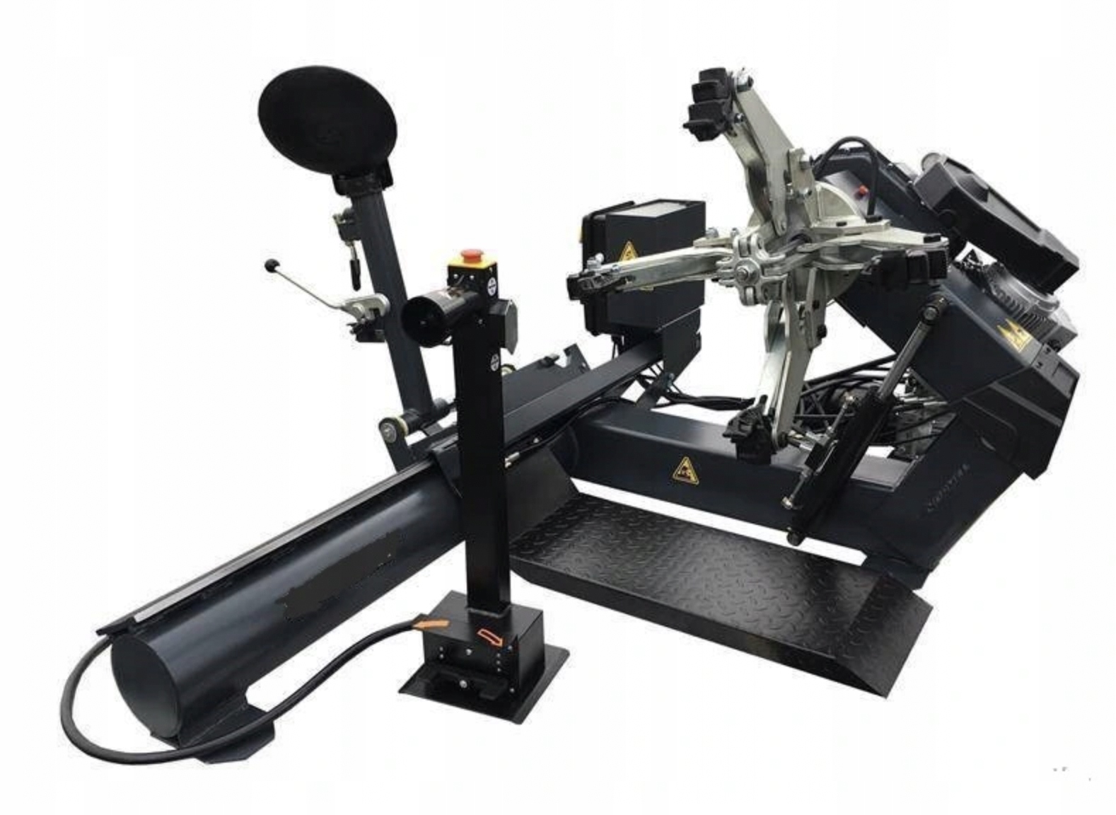 Опис шиномонтажного пристрою: призначений для монтажу та демонтажу камерних і безкамерних шин, для обслуговування коліс вантажних автомобілів, автобусів, сільськогосподарських машин, бортоломної пластини та кігтя, розміщеного на обертовій головці, що дозволяє швидко замінити інструмент, спеціально профільована бортова плита дозволяє ефективно демонтувати шини без ризику пошкодження, рухома платформа для швидкого та точного розвалу коліс, безпечна керуюча напруга (24 В) виключає ризик ураження електричним струмом, керування пристроєм з мобільної колонки
