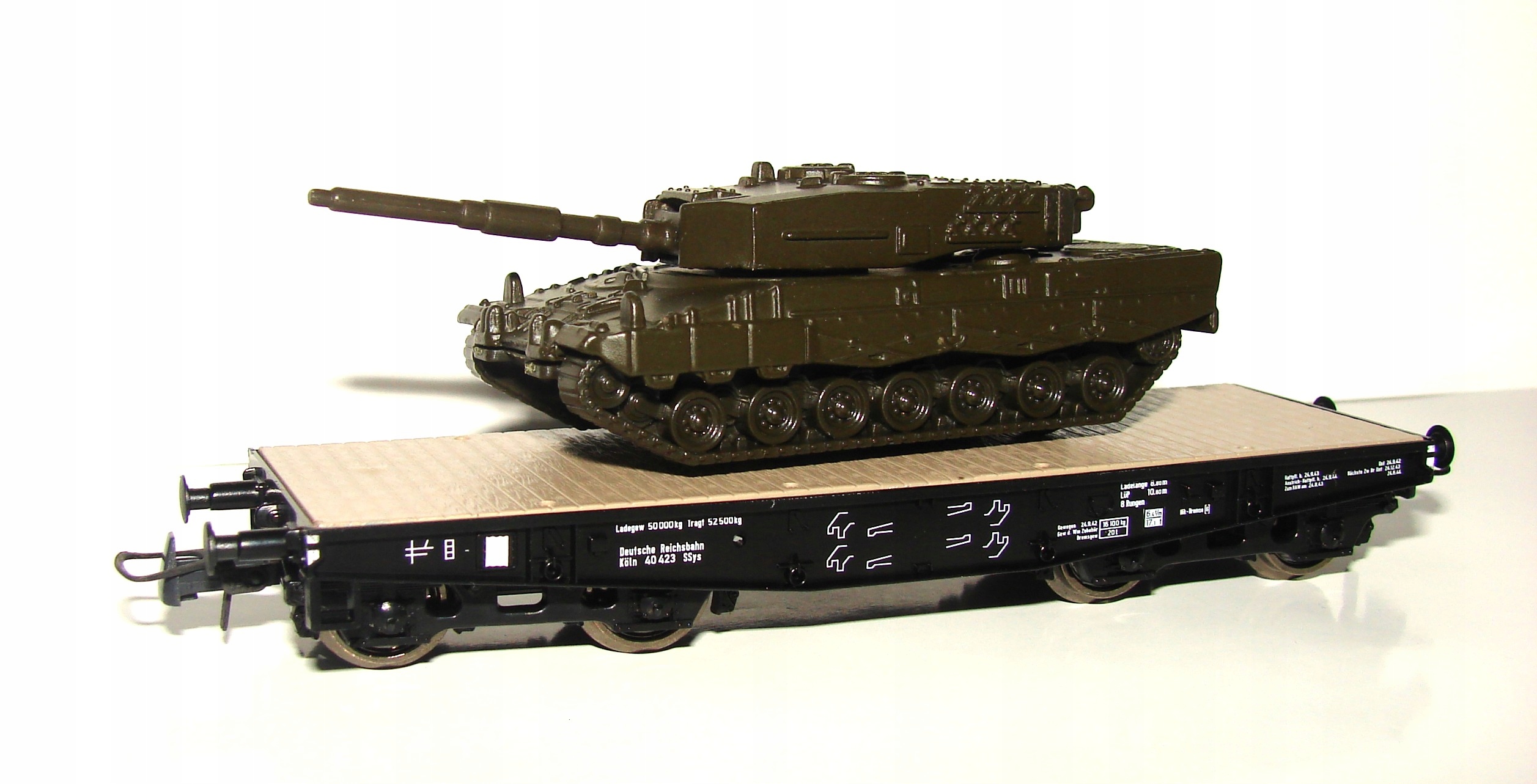 HO--Новий 4-вісний вагон-платформа фірми ROCO 46385 з вантажем, бачок LEOPARD, який видно на фото, в оригінальній упаковці, змінні зчіпки kk, металеві колеса та осі ізольовані з одного боку, знімна цистерна + деталі для самостійної збірки.