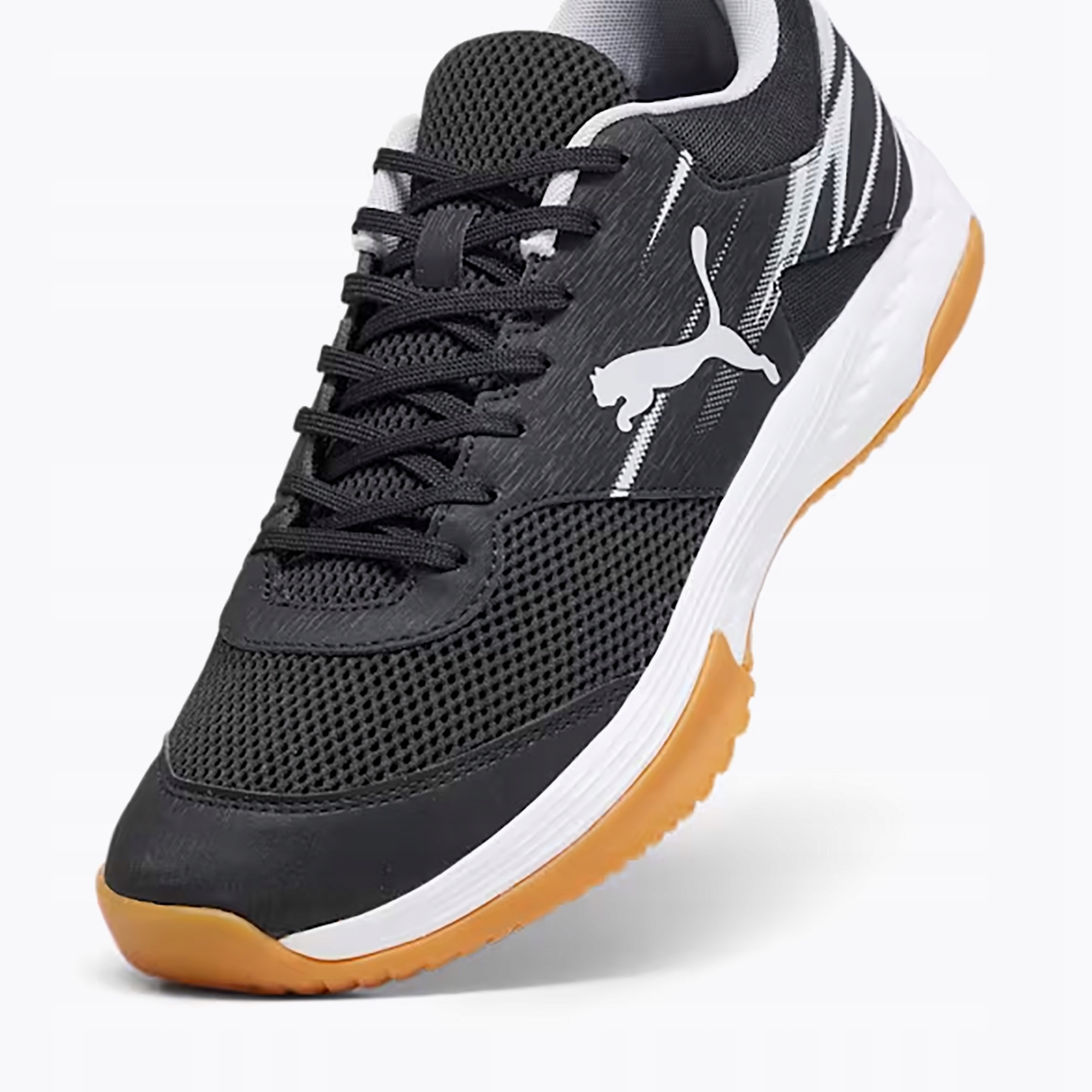 чоловіче взуття в приміщенні PUMA . Розроблений для гри у футбол у залі. Зручні взуття, що використовуються, мають легку та зручну верхню частину, з додатковими зшиваннями та сітчастими елементами. Високоякісні матеріали використовувались при взутті. Блокування дозволяє індивідуальне відповідне взуття до форми ніг. Гума -підошва забезпечує стабільність і гарантує хорошу адгезію.