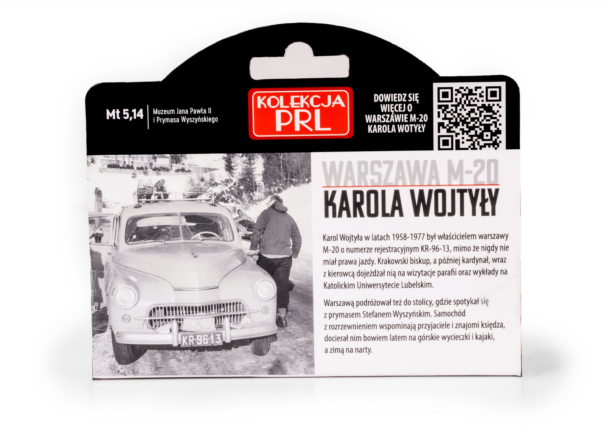 Колекція Польської Народної Республіки – Варшава Автомобіль Кароля Войтили М20 – це унікальна модель, яка повертає нас у часи, коли майбутній Папа Іван Павло ІІ, як єпископ Кракова, користувався цим легендарним транспортним засобом. Warsaw M20 був автомобілем, яким Кароль Войтила керував у 1958-1977 роках, хоча він ніколи не мав водійських прав. Тим не менш, завдяки допомозі водія, автомобіль був його щоденним транспортним засобом, яким він їздив на парафіяльні візити, лекції в Люблінському католицькому університеті, а також на зустрічі з Примасом Стефаном Вишинським.