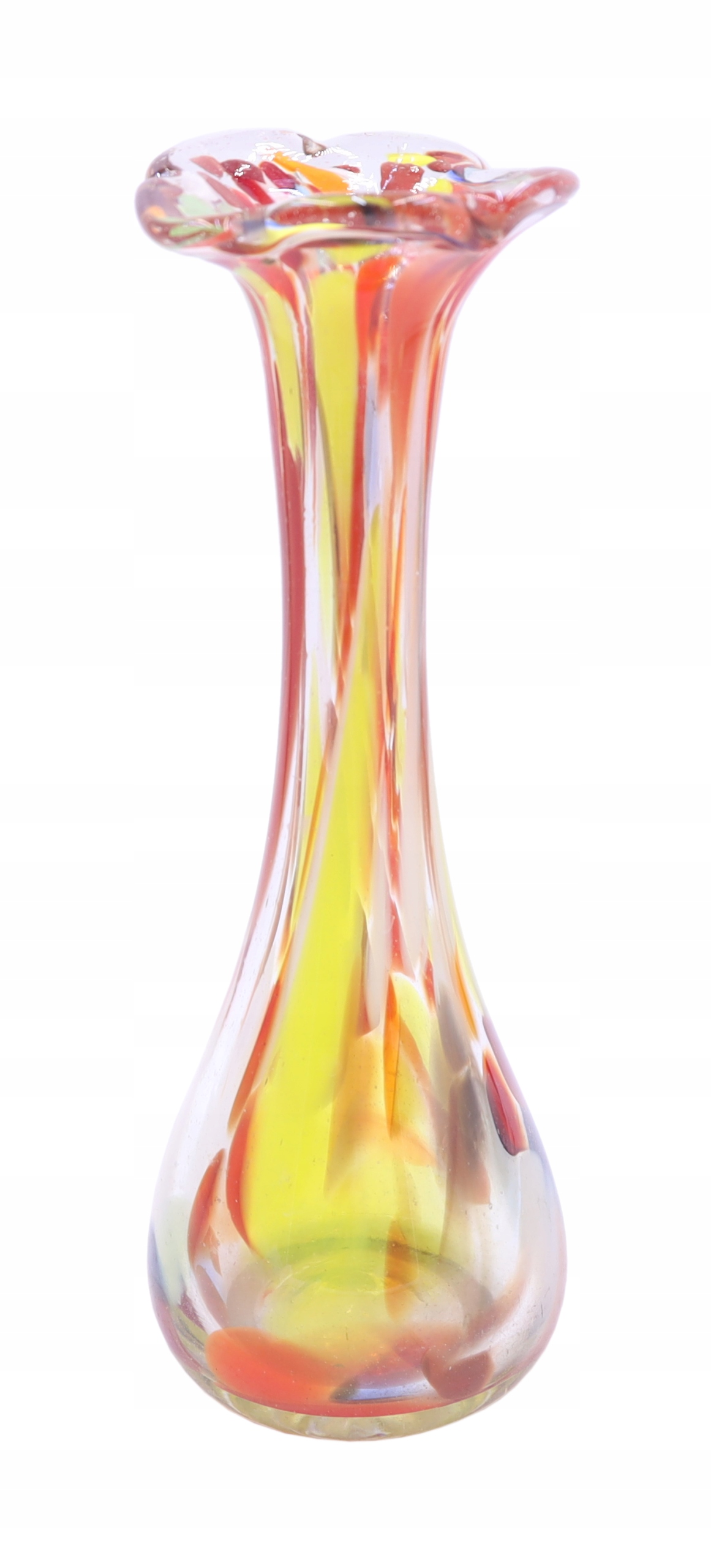 Красиво розфарбована ваза часів Польської Народної Республіки. Вази цього типу виготовляли декілька польських скляних заводів. Сліди використання, на фото видно дефект днища. Розміри: 29 х 10 см. Рекомендую колекціонерам