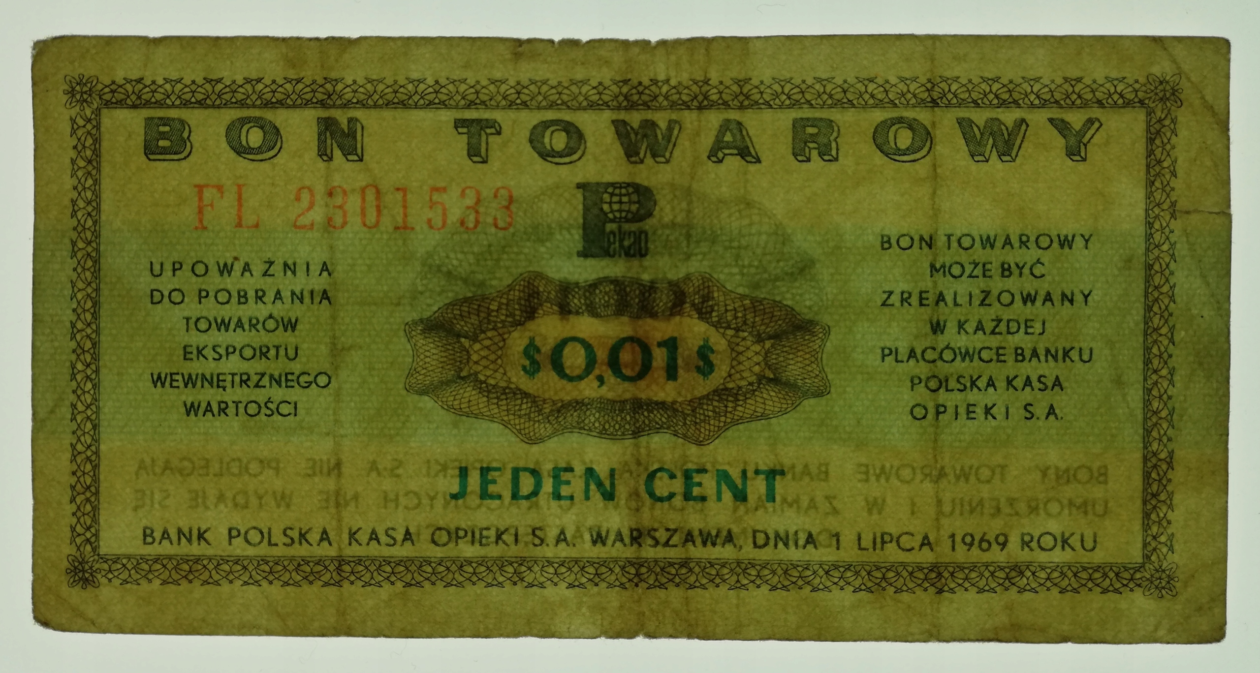Ваучер Pewex номіналом 1 цент 1969 року серії FL