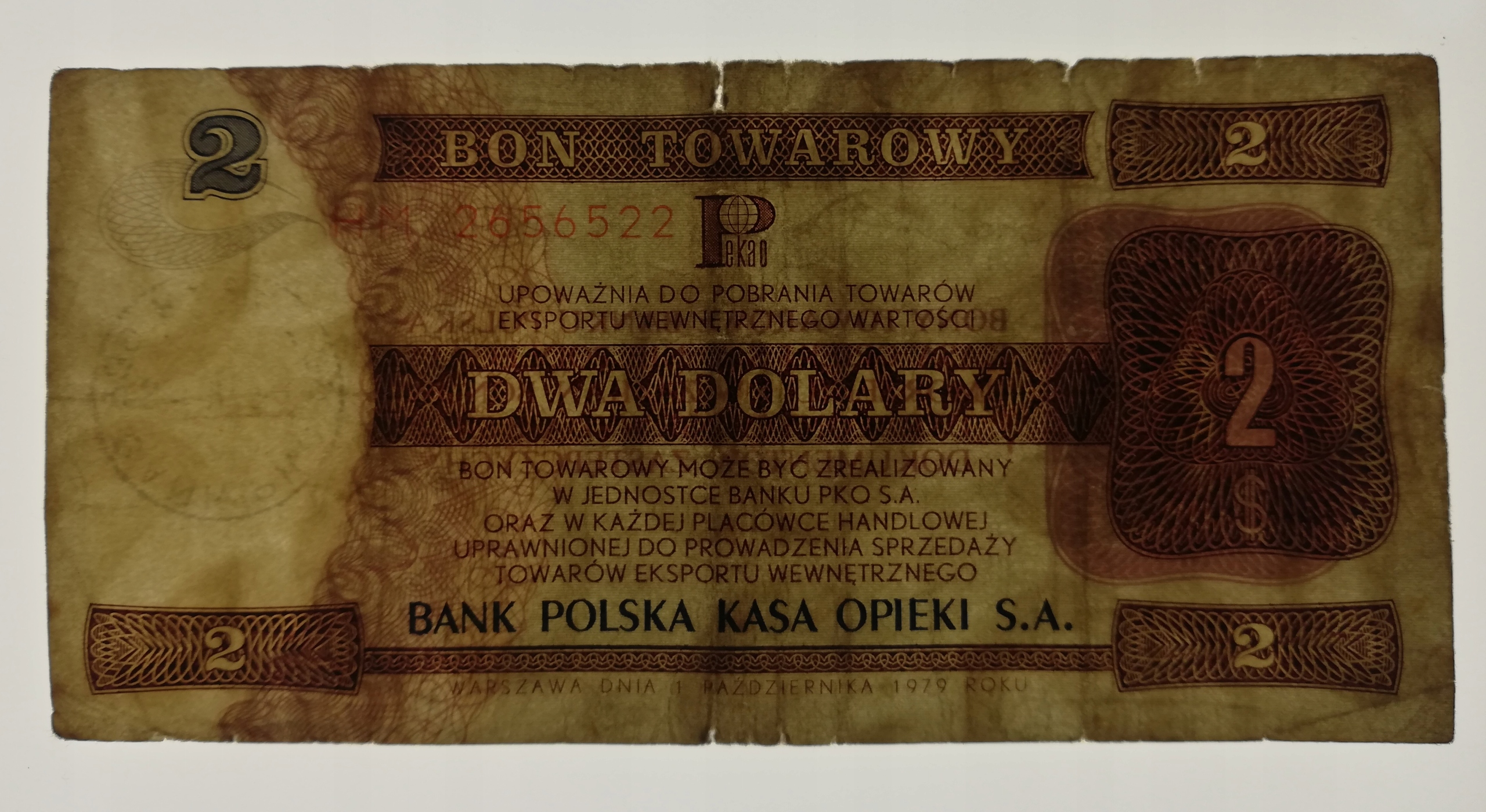- Опис номіналу: товарний ваучер серії Pewex HM номіналом 2 долари 1979 року, рідше котирується, відносно високий номінал