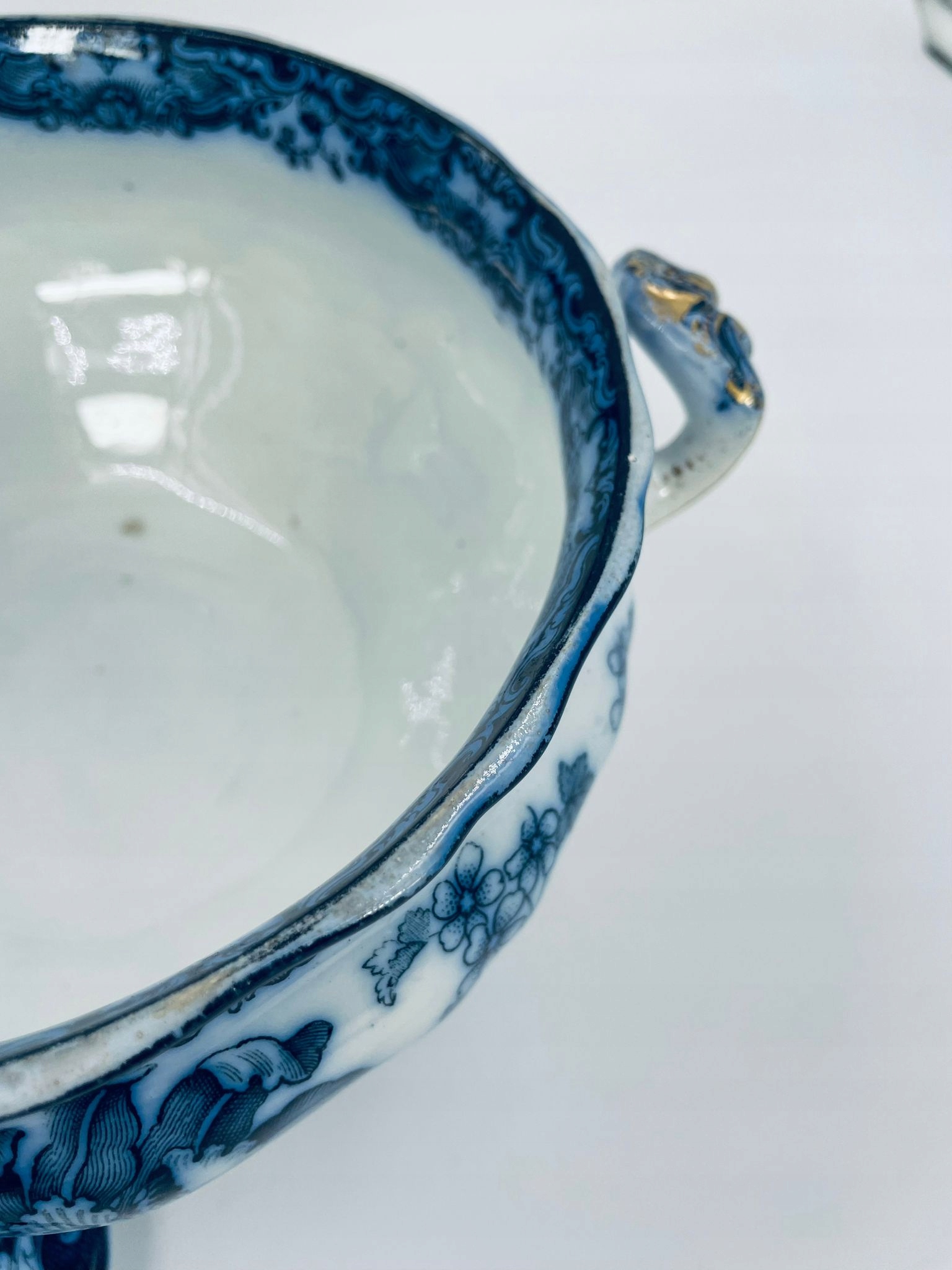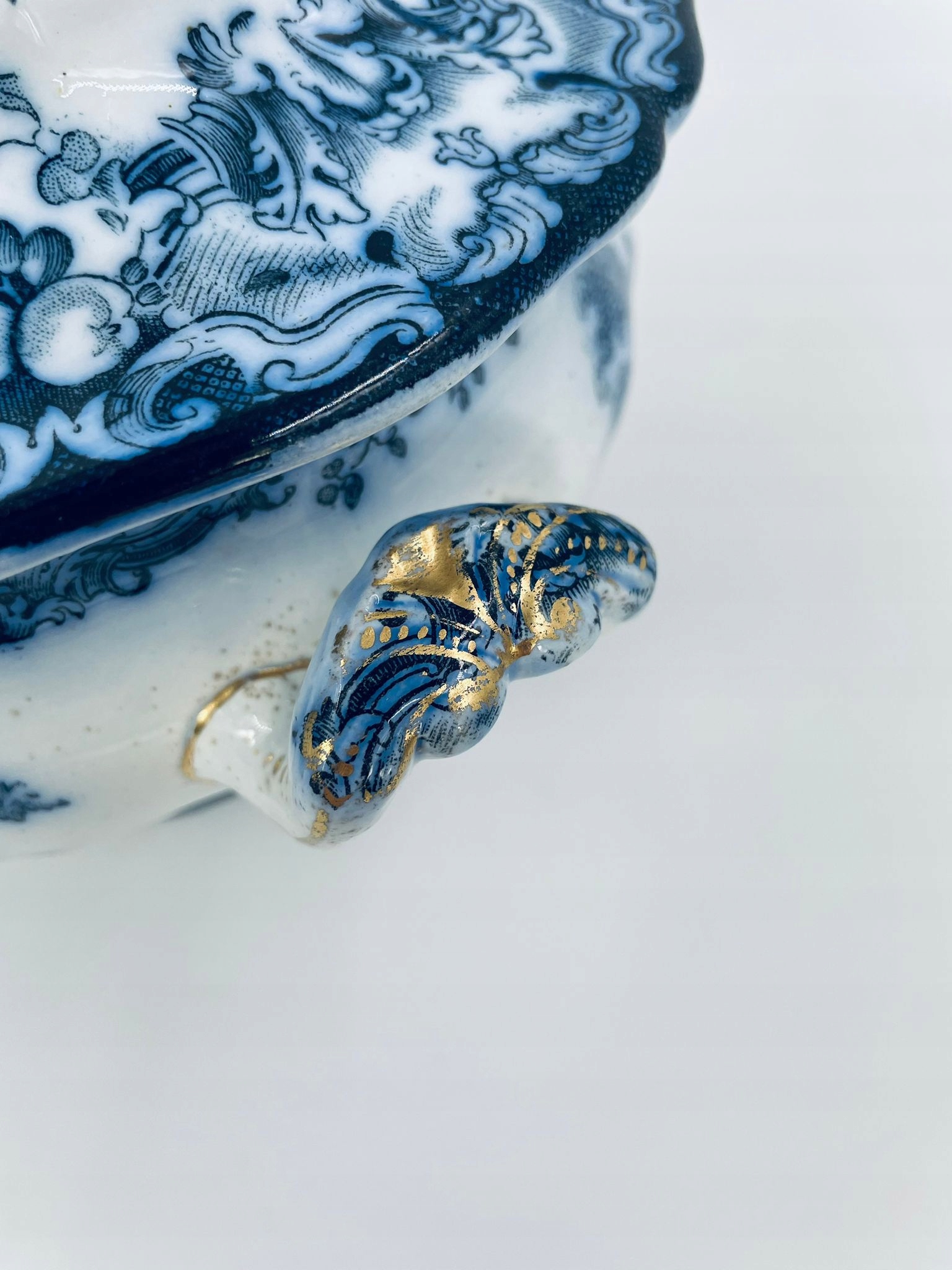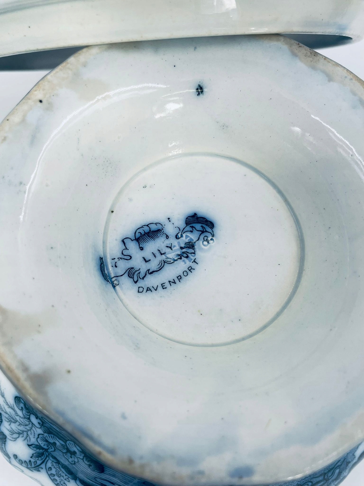 Ваза відомої англійської мануфактури Davenport із серії Lily, виготовлена з високоякісної білої порцеляни. Ваза з кришкою характеризується багатим декором і квітковими мотивами темно-синього кольору, декоративними ручками з золотими акцентами. Має потертості.