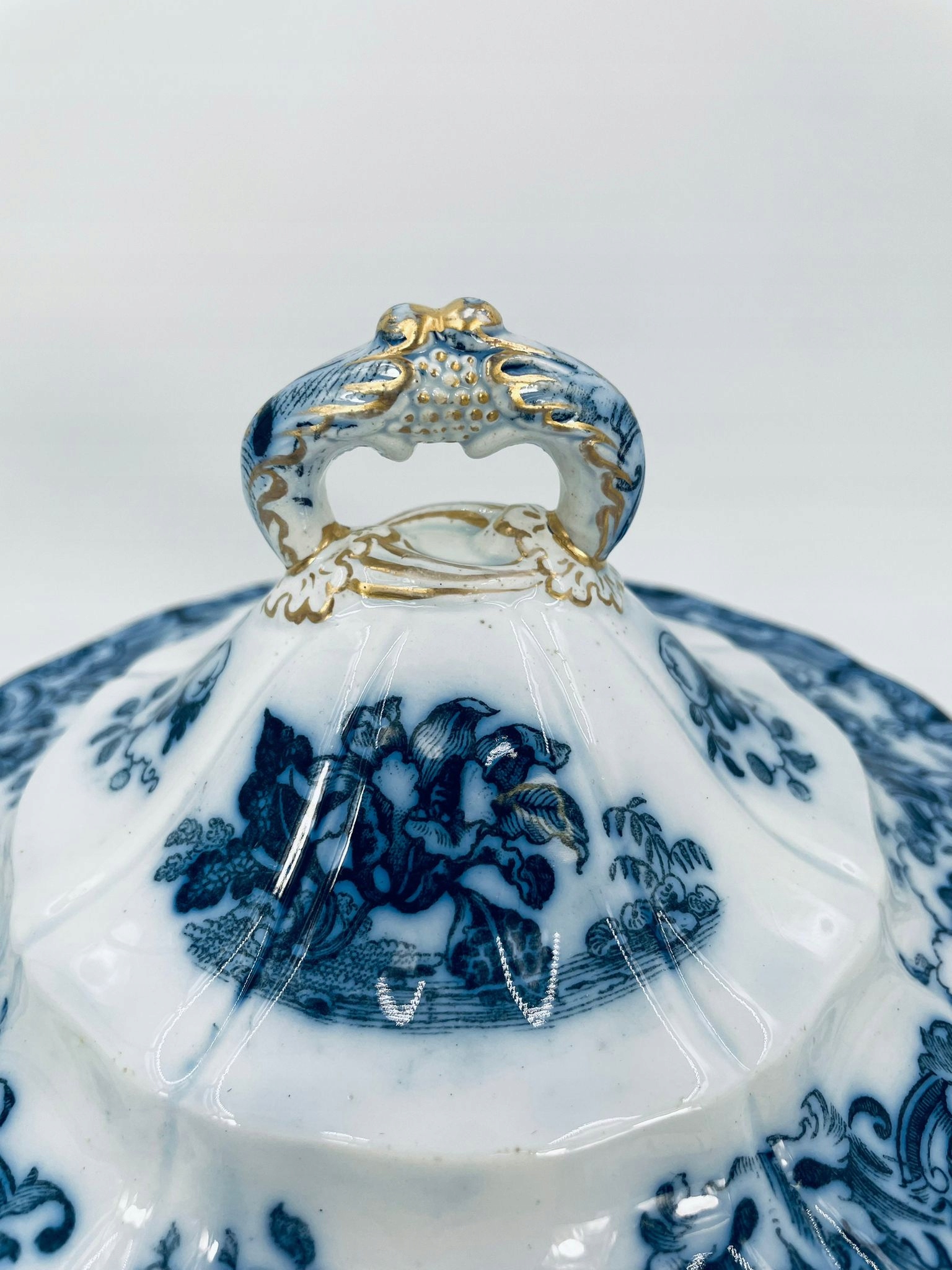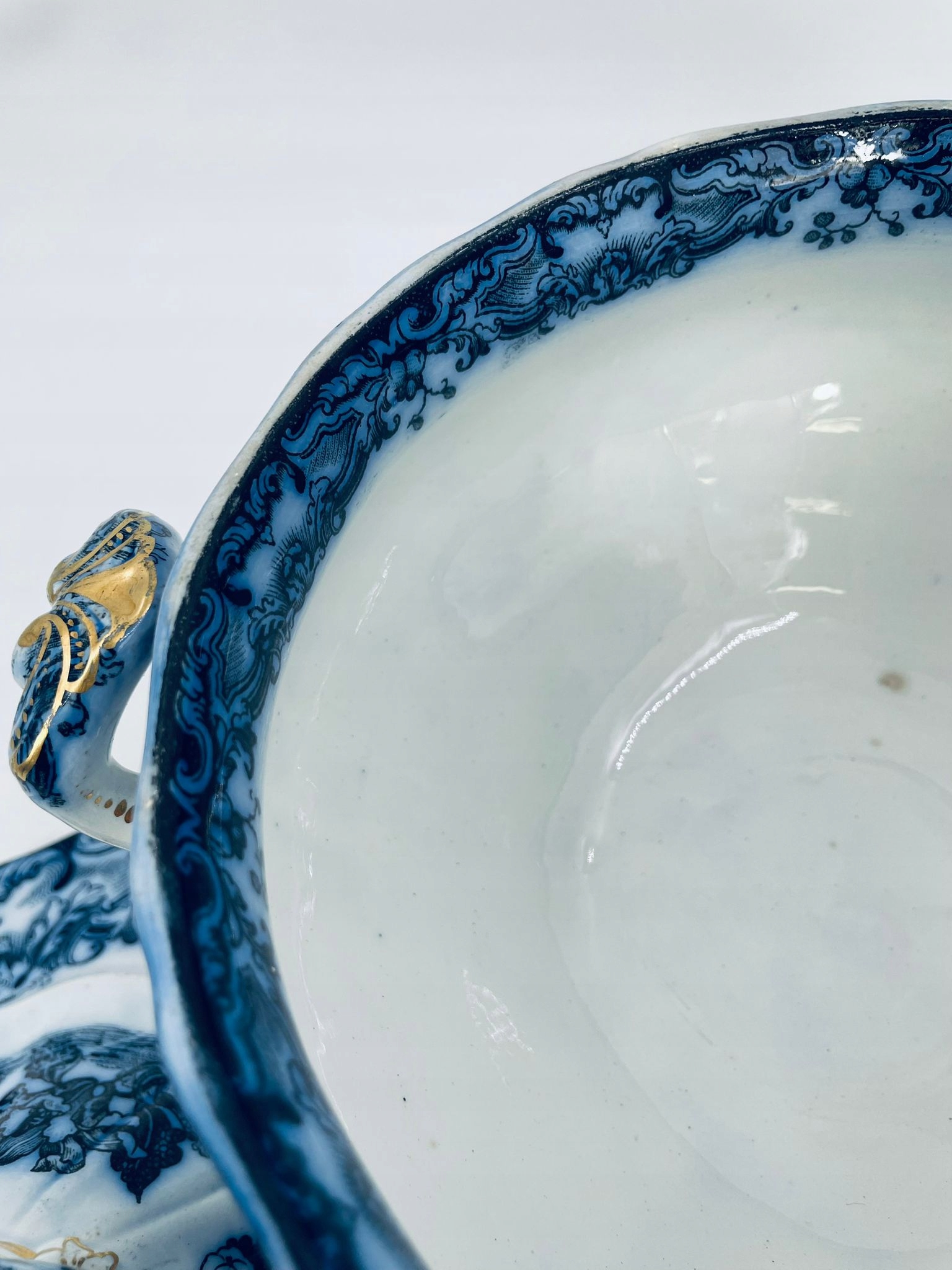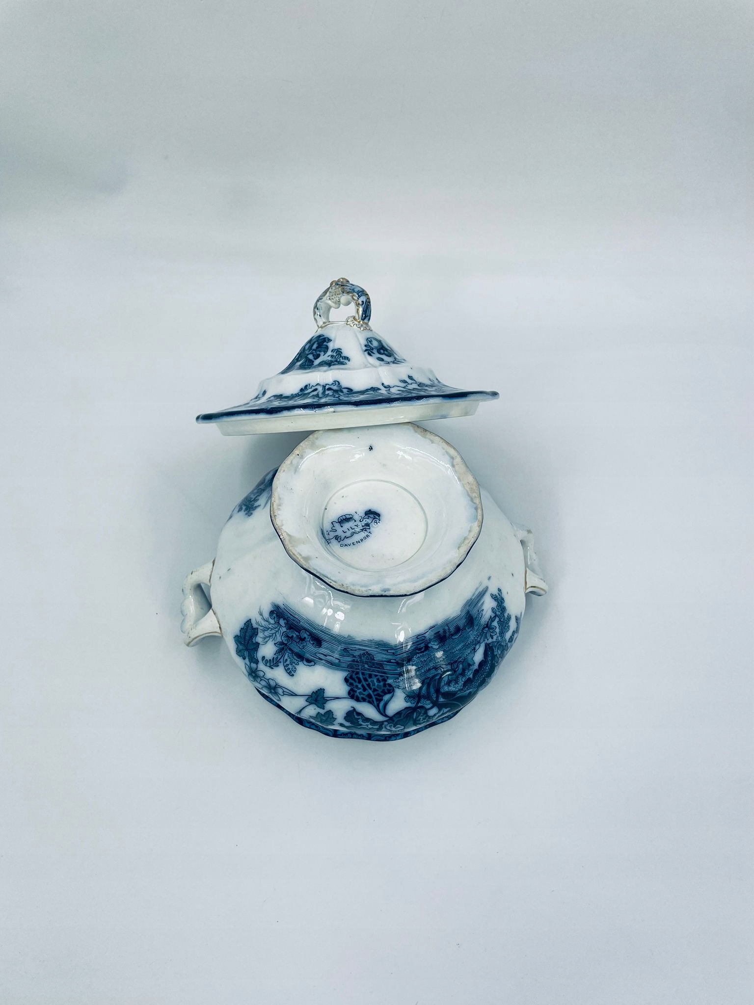 Ваза відомої англійської мануфактури Davenport із серії Lily, виготовлена з високоякісної білої порцеляни. Ваза з кришкою характеризується багатим декором і квітковими мотивами темно-синього кольору, декоративними ручками з золотими акцентами. Має потертості.