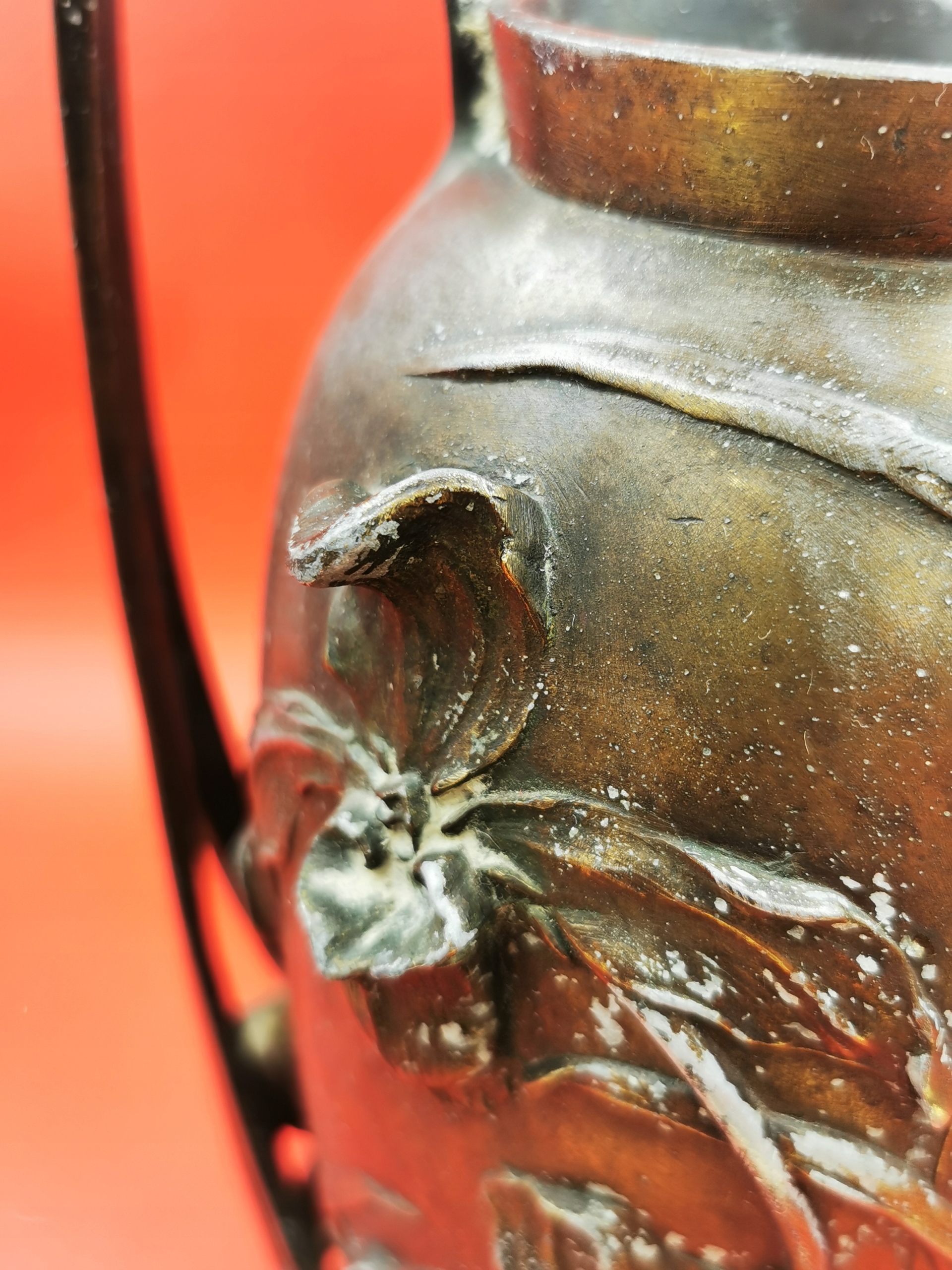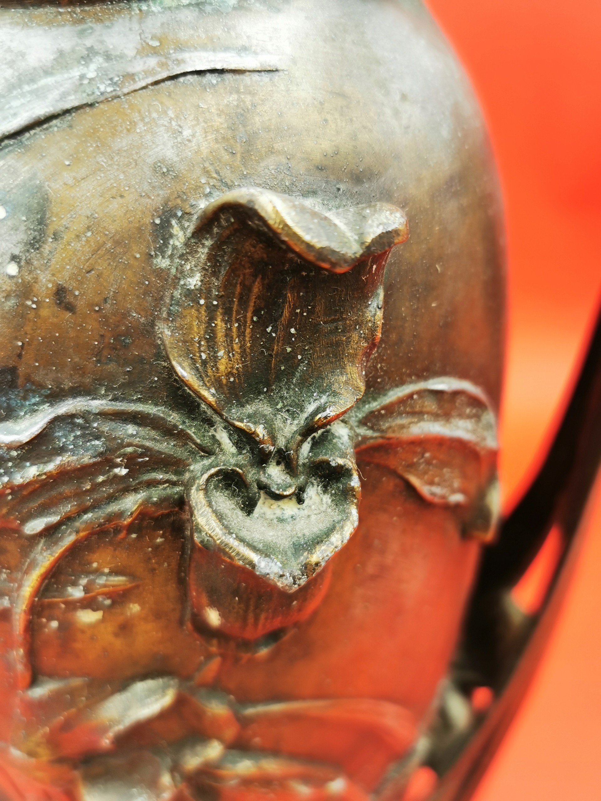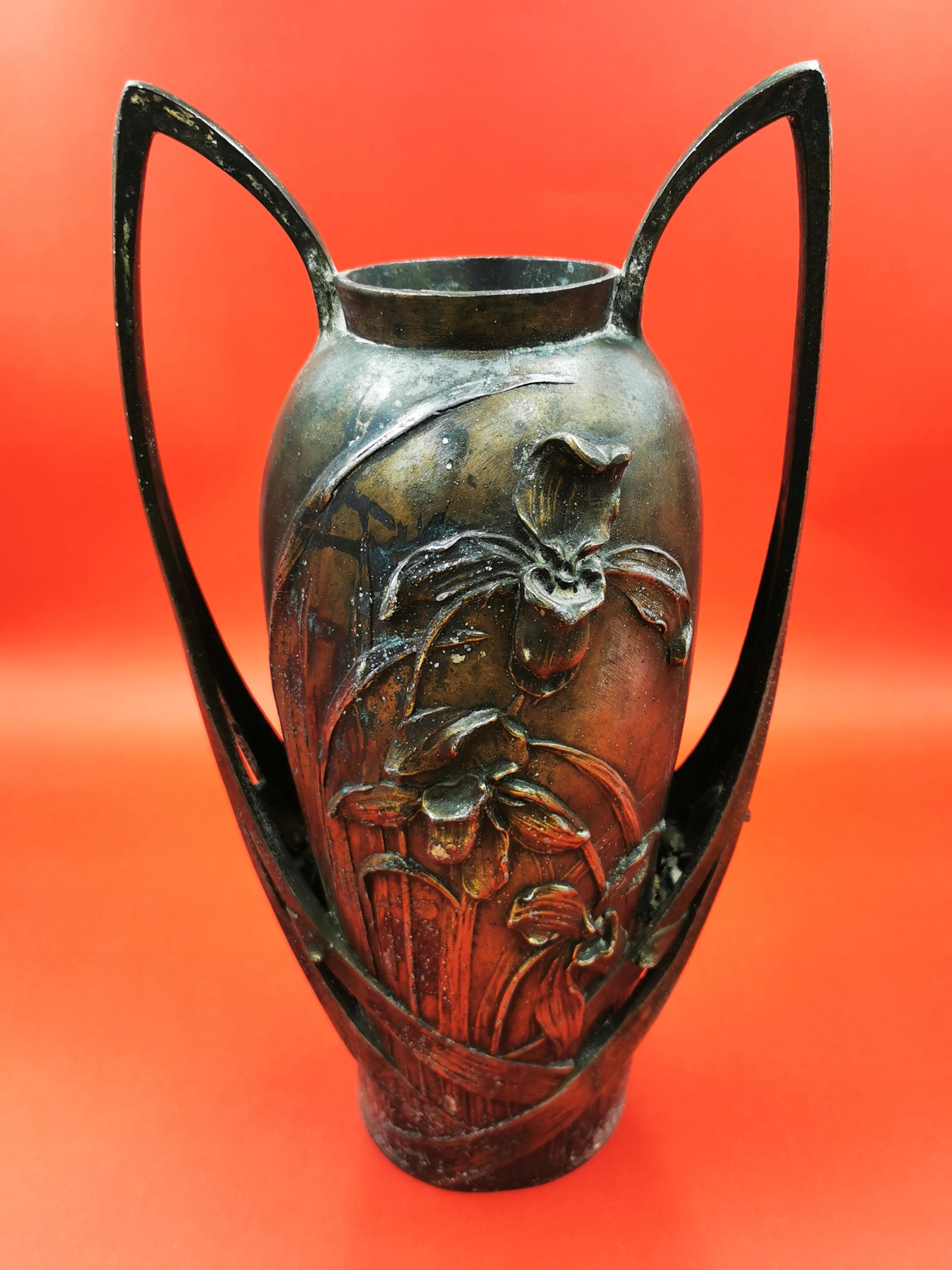 Представляємо надзвичайну вазу від Blanche Poccard de Saintilau 1902 року. Ваза виготовлена зі спеціального металевого сплаву з додаванням латуні, що надає їй специфічний колір зеленої патини, що імітує коричневий. Крім того, він має гарний декор у вигляді барельєфа у формі ірисів. Його безсумнівною перевагою є тонка форма і привабливі ручки, розташовані з обох боків посудини. Ваза має підпис дизайнера та оригінальний підпис, що доводить її французьке походження.