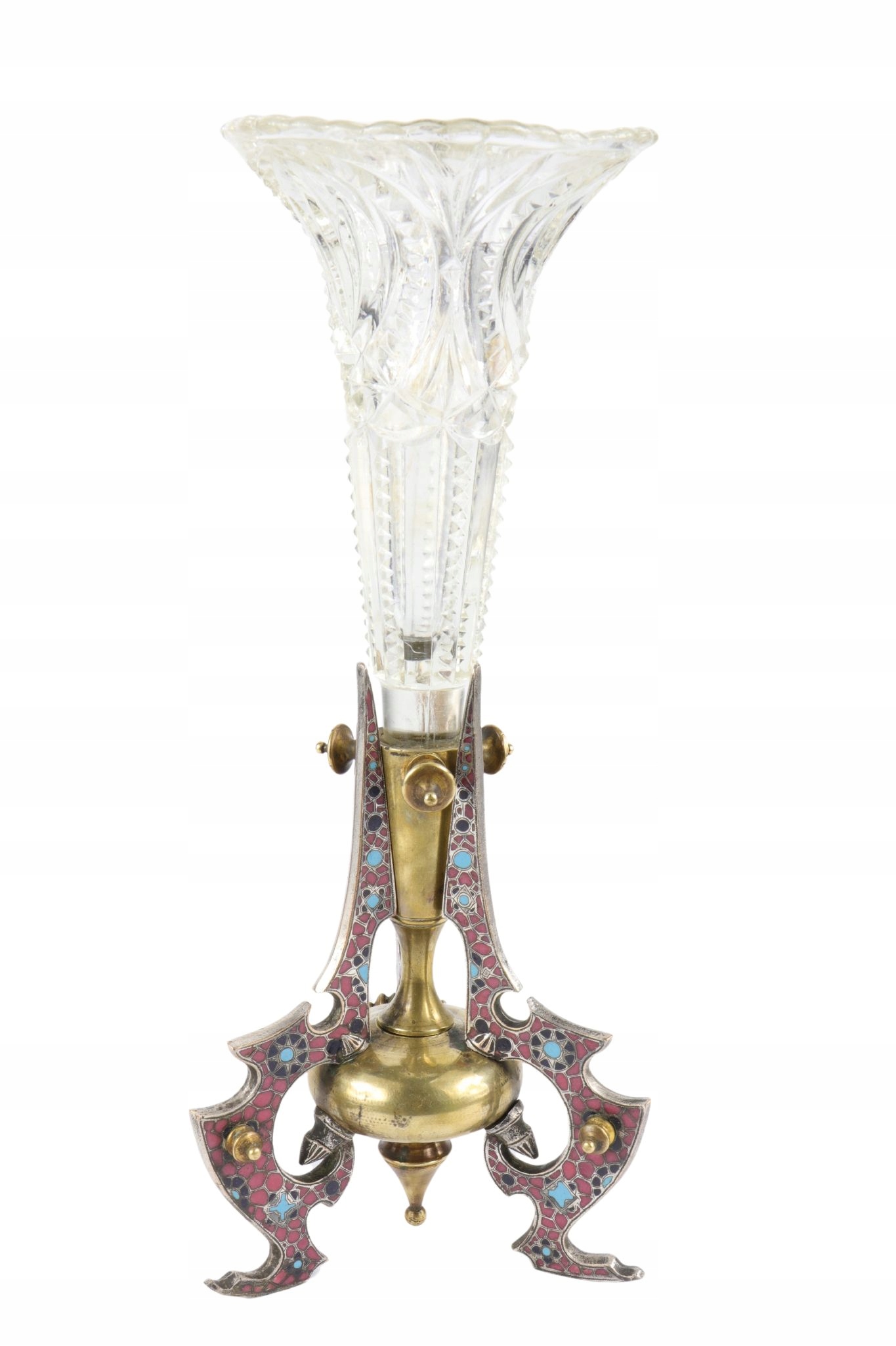ваза зі скляною флейтою вази, прикрашена французькою дитячою емальною під назвою Champleve. Емальня, закладена на срібло -коричневому. Масивне глазуроване скло. Прекрасна дуже оригінальна форма вази. Зображення хорошого стану, видимі мінімальні ознаки використання. Одна з ніг злегка рухається