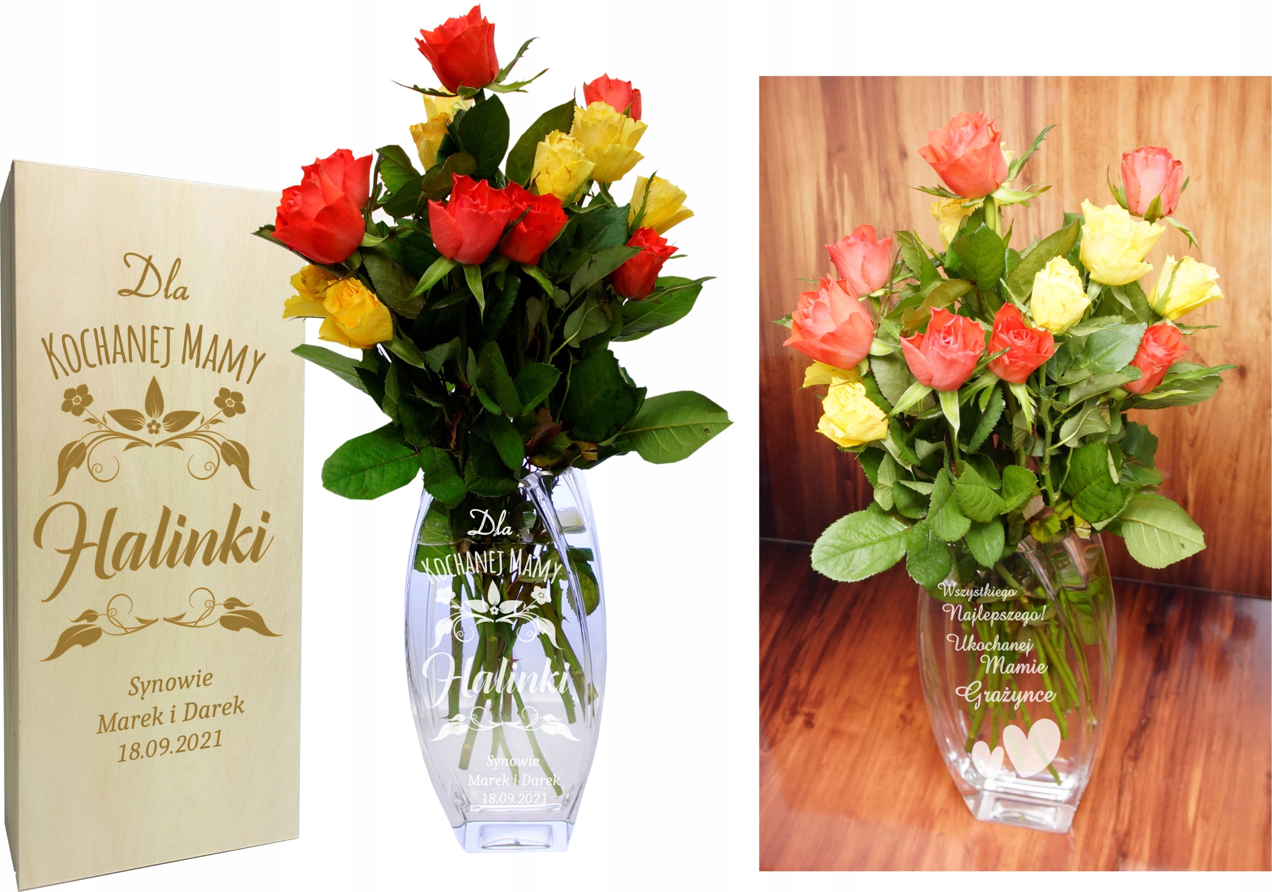 Аукціон стосується елегантної вази для квітів з шкатулкою. Шкатулка і ваза з одного боку прикрашені лазерним гравіюванням. Прикраса лазерним гравіюванням забезпечує міцне, точне і тонке відтворення графічного символу на склі/дереві. Таким чином, ми можемо розмістити вашу ідею, графіку, візерунок, логотип, текст на вазі, яка, безсумнівно, приверне увагу домочадців або друзів під час зустрічі. Скло виготовлено вручну, тому можуть бути маленькі бульбашки повітря, які жодним чином не заважатимуть.