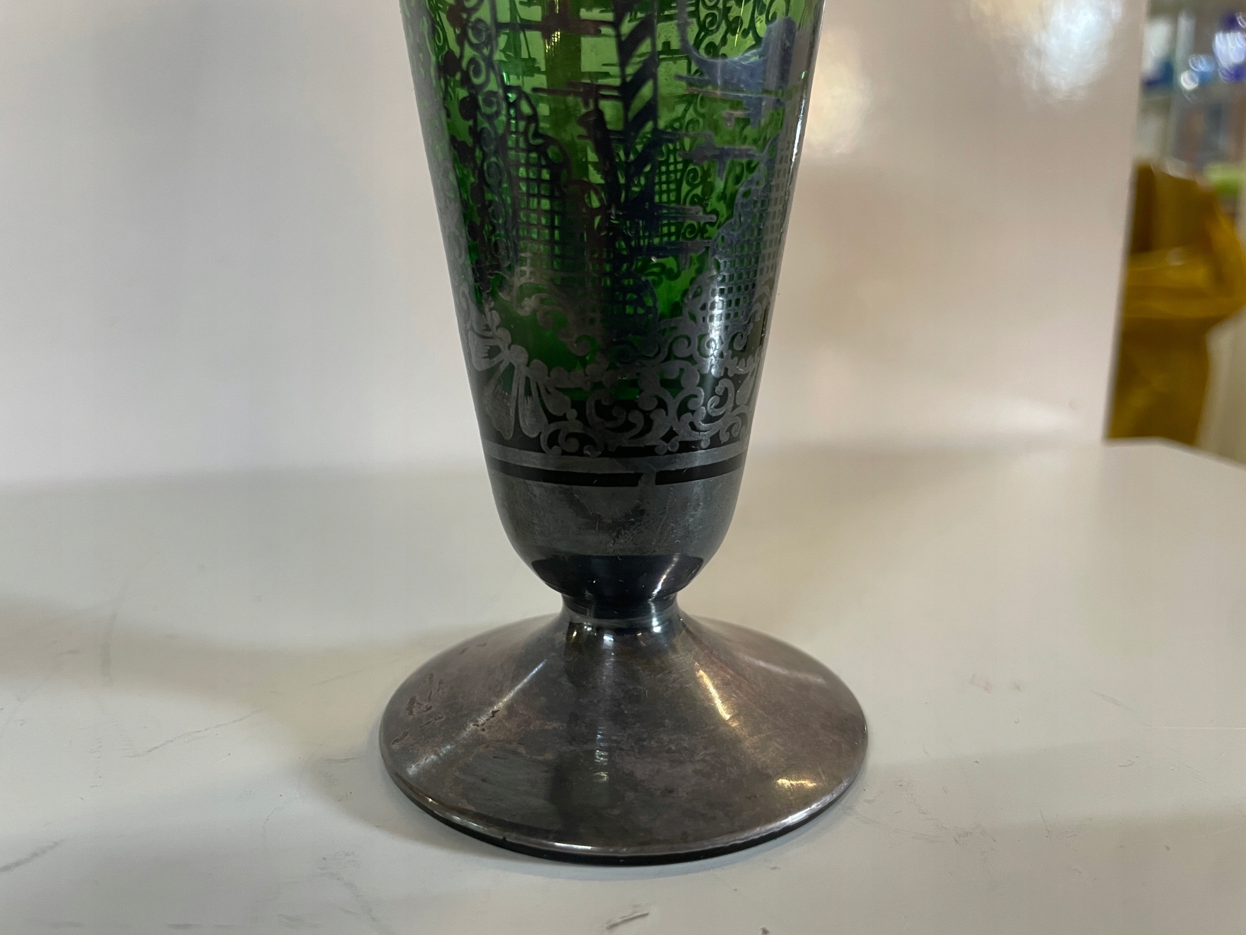 Ваза із зеленого скла, прикрашена срібним сецесійним арт -деко 20/30