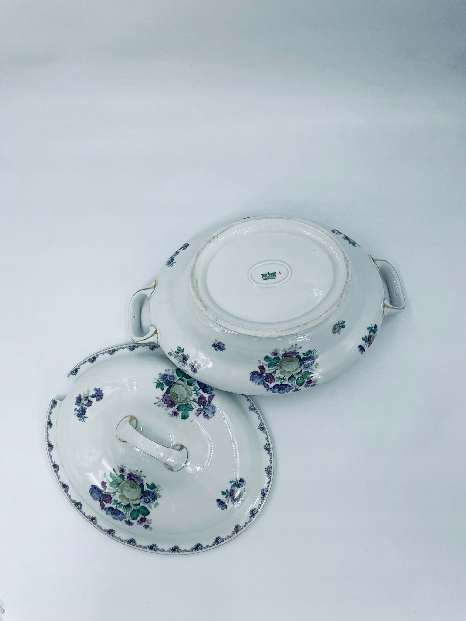 Ваза з ручками від Krautheim Selb Bavaria, виготовлена з білої порцеляни, прикрашена квітковою гірляндою по краю та букетами фіолетових квітів. Ваза оздоблена золотим обідком і має потертості на позолоті.