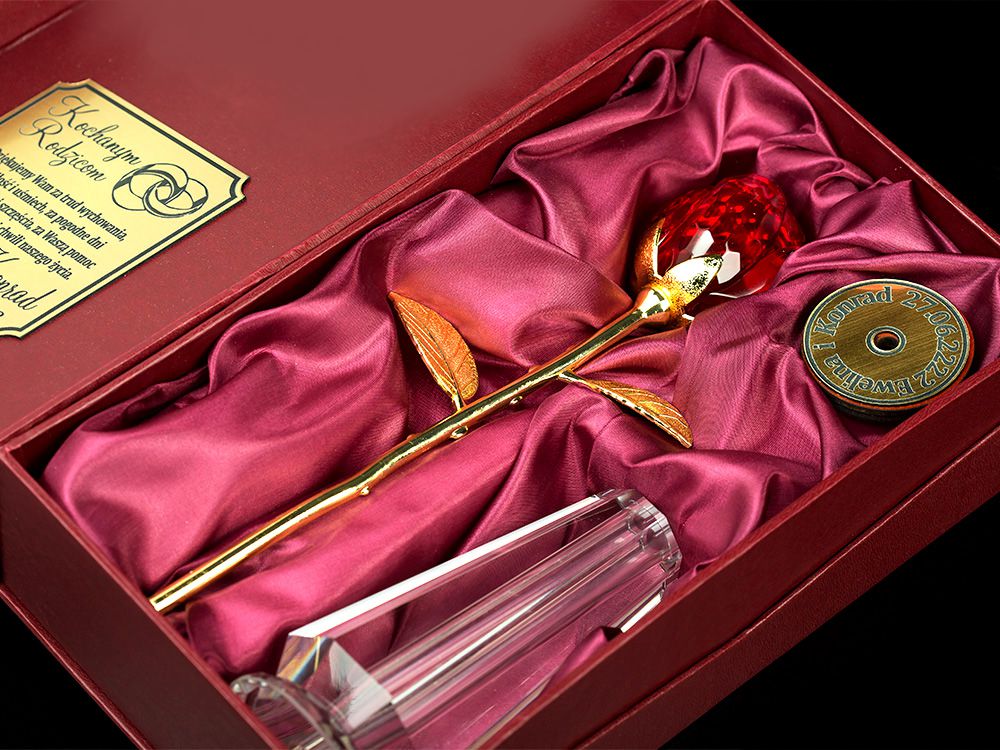 Красива подячна записка – виготовлена з бордового кришталю, огранена вручну та сформована троянда з пофарбованою золотом металевою ніжкою, з видно багато деталей. Крім того, в набір входить КРИШТАЛЕВА ВАЗА і вигравірувана підставка з присвятою, щоб троянда виглядала красиво на почесному місці в кожному домі. Доповнює все приголомшливий бордовий футляр із вигравіруваною присвятою, такої якості ви не знайдете більше ніде. Можу зробити для вас - ПОДАРУНОК НА БУДЬ-ЯКИЙ НАВОД (весілля, гостини, хрещення, причастя, день народження, вісімнадцяти іменини, ювілей, річниця весілля, день матері та батька, день дідуся та бабусі, день Святого Валентина, день вчителя, та ін.). b>