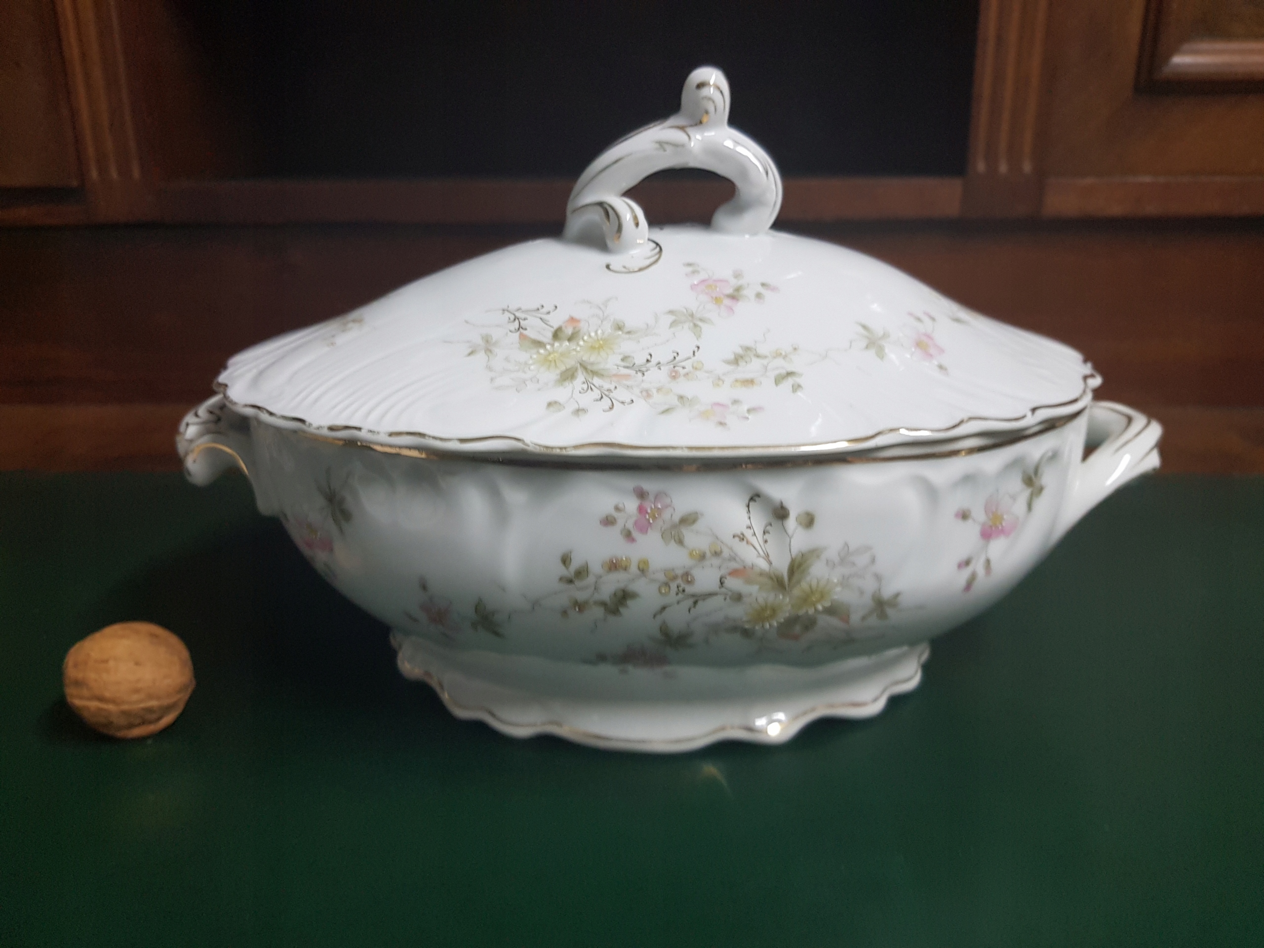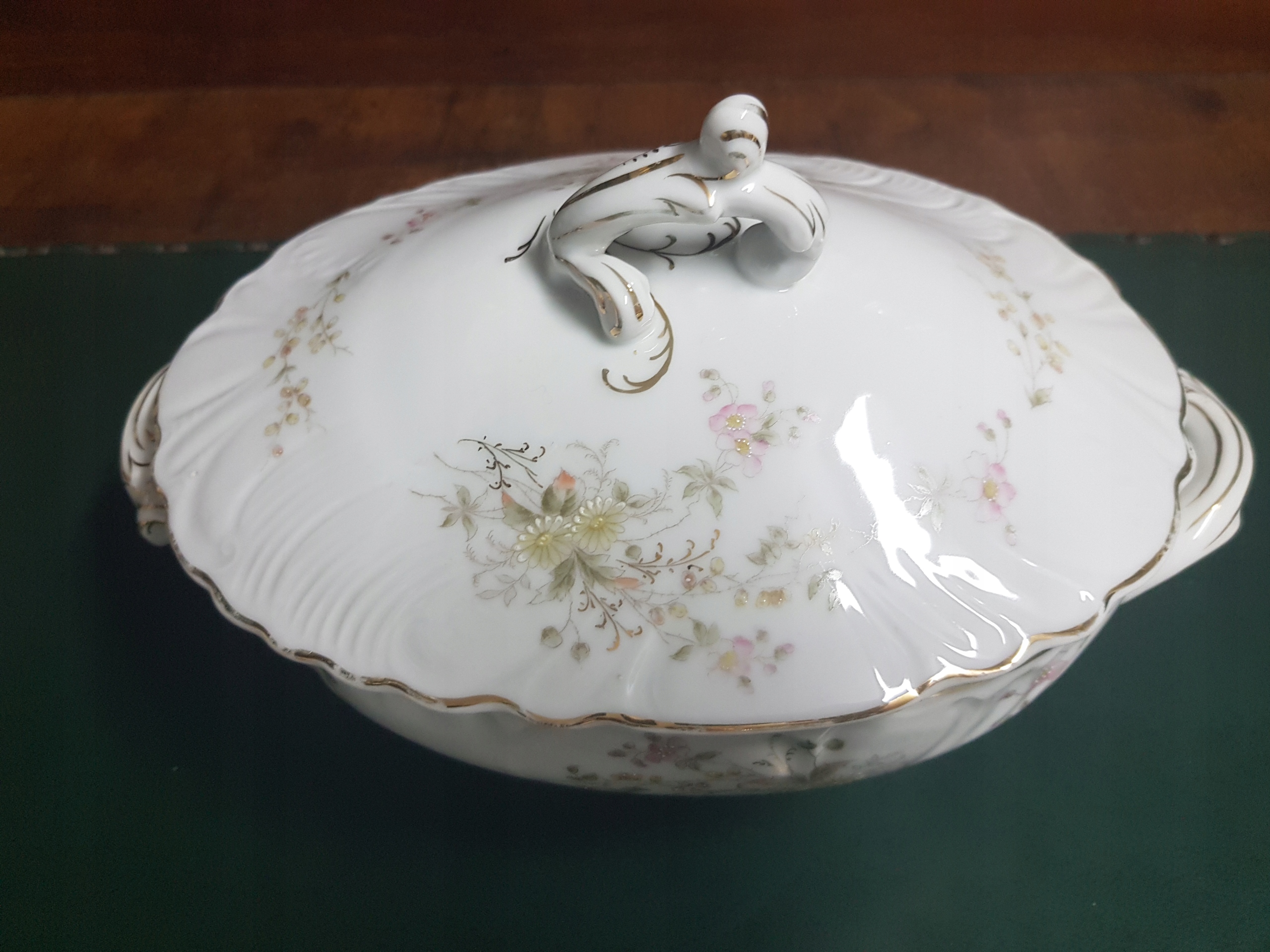 Предмет аукціону - ваза для супу в стилі модерн. Прикрашена квітковим мотивом. Тиснення. Потертості до позолоти по краю кришки.