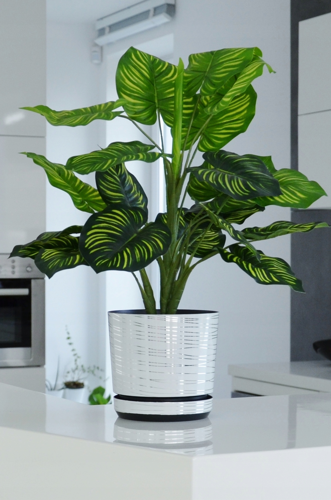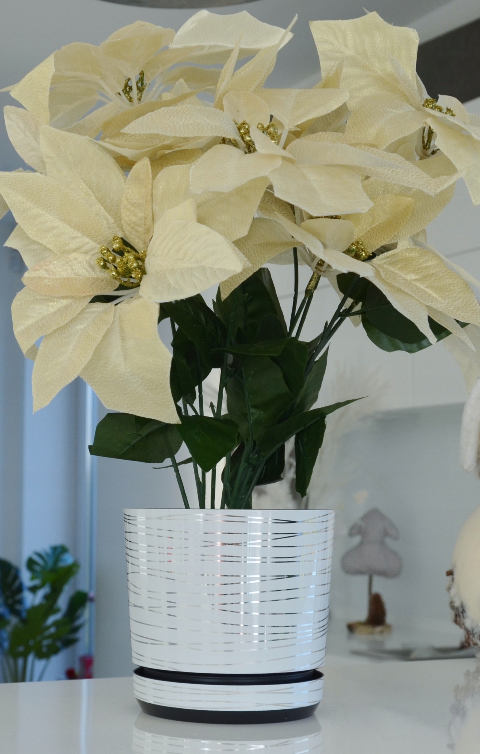 Якщо вам потрібно створити розкішний мінімалістичний дизайн інтер'єру, ідеальним рішенням стане поєднання білого з сріблястими аксесуарами. Прохолодна і блискуча срібляста нитка додає вазону вишукані нотки в інтер'єр. Декоративний вазон створює витончений, елегантний ефект, підкреслюючи ексклюзивність меблів, стилю та декору.
