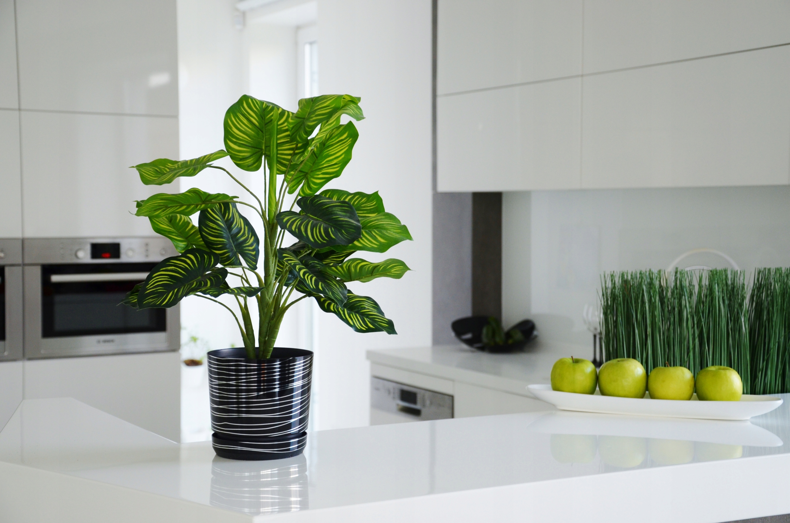 Декоративні горщики з травами також на кухні з додаванням срібла ефектно виглядають, наприклад, поруч із кухонним обладнанням, підкреслюючи сталеві елементи сучасної техніки.
