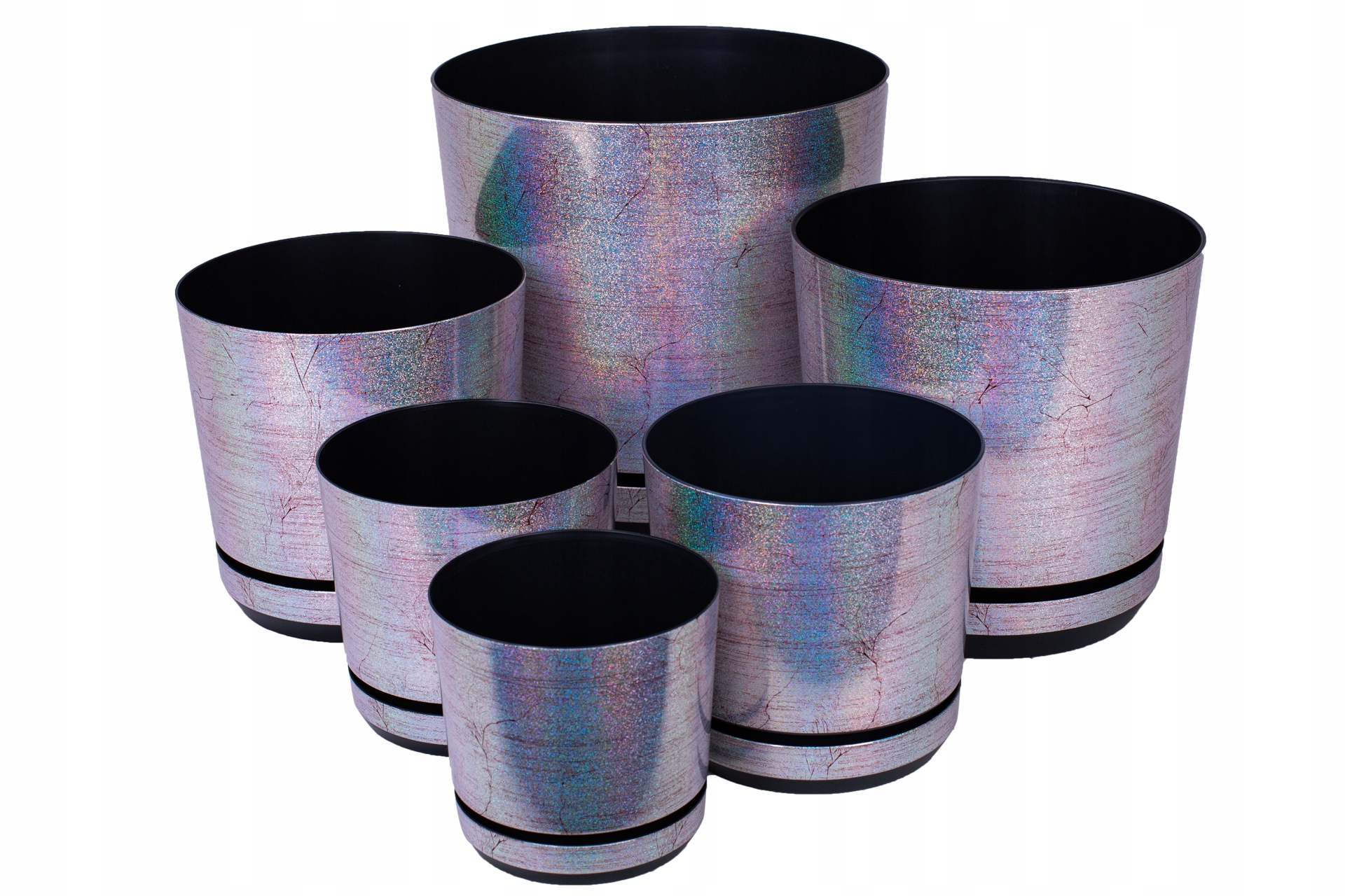 Металевий декор створює тривимірний голографічний ефект, переливаючись усіма кольорами веселки, завдяки чому квітковий горщик набуває надзвичайного шарму.