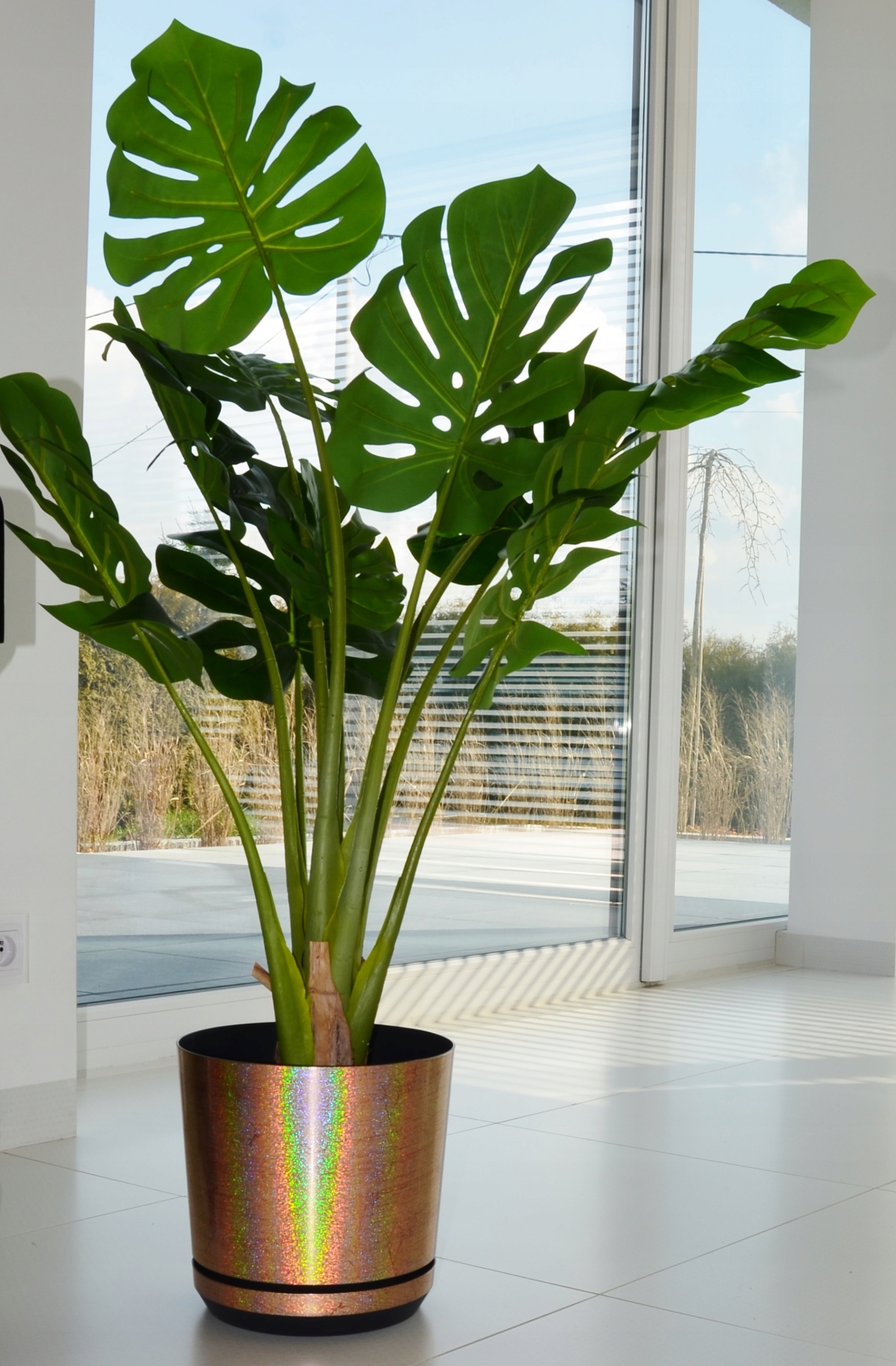 Металевий декор створює тривимірний голографічний ефект, переливаючись усіма кольорами веселки, завдяки чому горщик набуває надзвичайного шарму.
