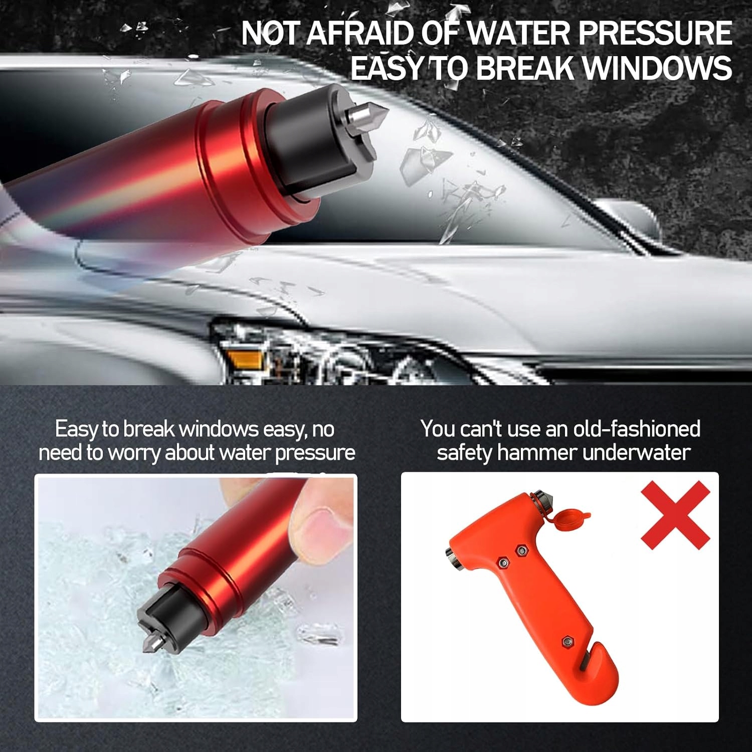 не боїться тиску води: навіть під водою наш рятувальний молоток легко розбиває скло, не піддаючи себе тиску води. Відкрийте двері автомобіля або ви під водою, ці рятувальні молотки - абсолютна необхідність! Цей рятувальний пристрій ідеально підходить до буфера автомобіля, буфера дверей або підлокітника. Поділіться ним з родиною та друзями, щоб залишатися спокійними!