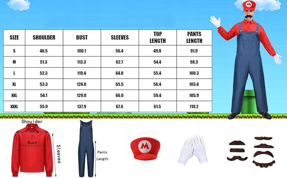 - Повний вигляд героя сантехніка: 1 х деталізований синій костюм, 1 х червона сорочка, 1 x знакова капелюх, 1 х рукавички, різні куби. Поліпшуйте свою гру в костюм завдяки цьому легендарному костюму супер для дорослих братів. 4 Більш сильні шви можна використовувати навіть для робочого одягу